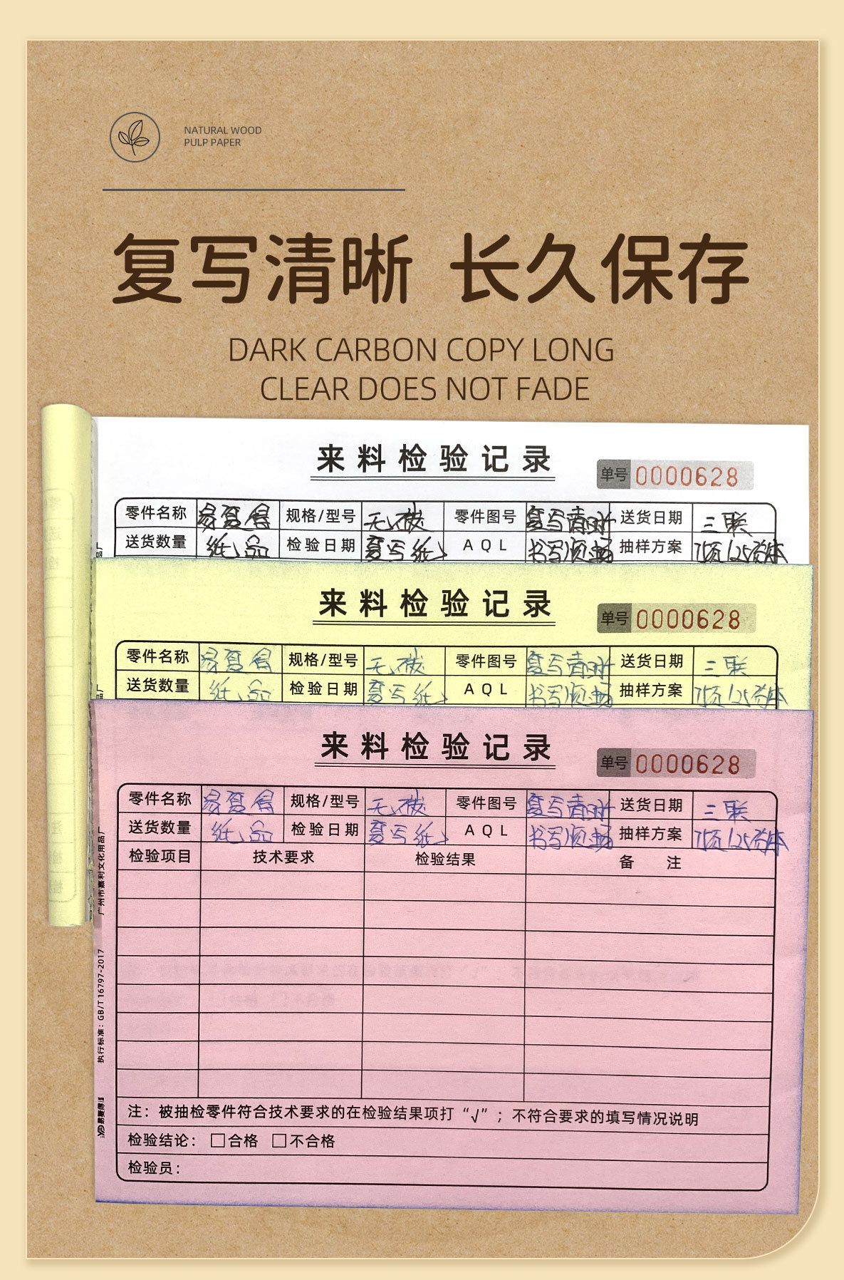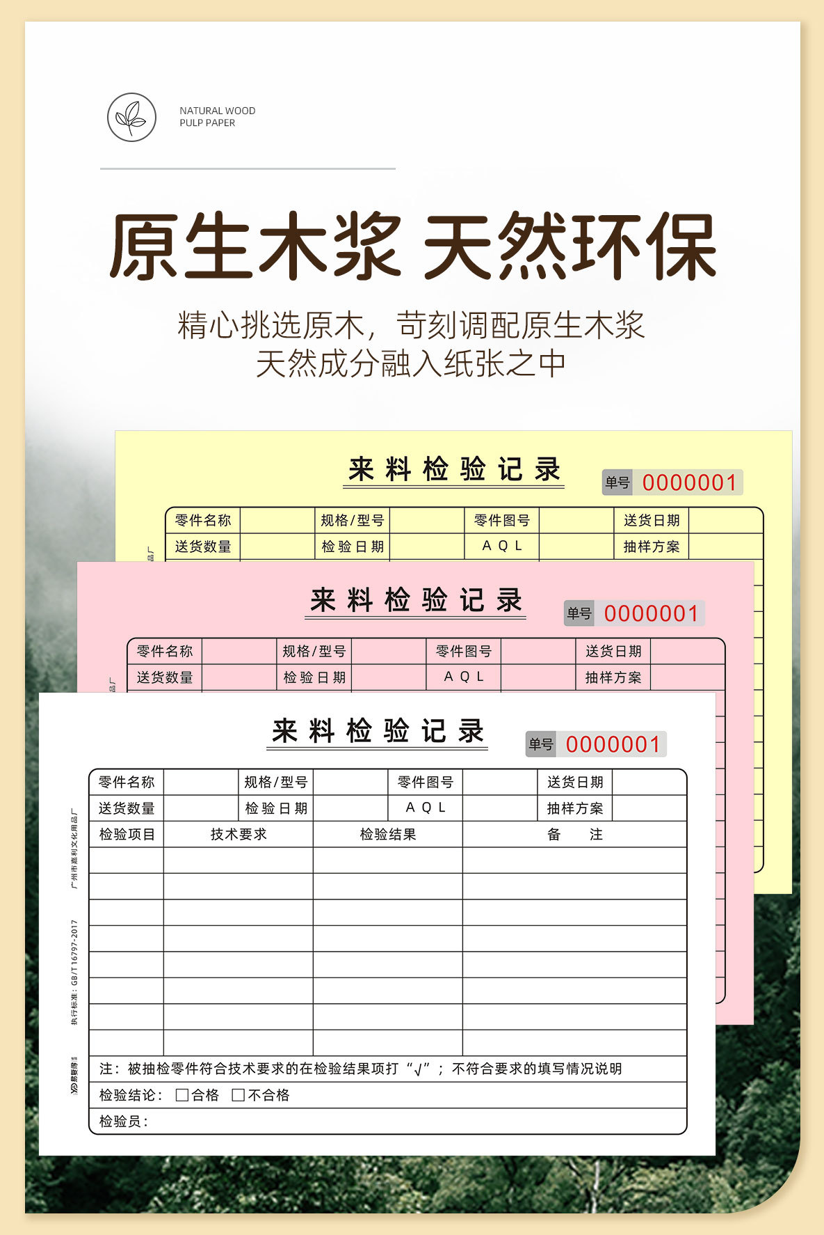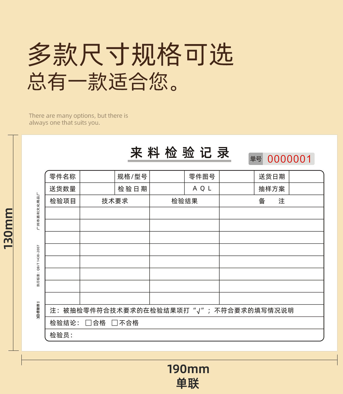 カラー 【単票】入荷検査記録【片面60枚】1冊,【2部】支給材料検査記録【80ページ、40部】1冊,【三聯】支給材料検査記録【75ページ25部】1冊,【二联】品質検査報告書【80ページ40部】1冊,【三聯】品質検査報告書【75ページ25部】1冊,【単票】初回検査・抜き取り検査記録表【片面60枚】1冊,【2部構成】初回検査・抜き取り検査記録表【80ページ、40部】1冊,【単票】不良品処理票【片面60枚】1冊,【二联】不合格品処理書【80ページ40部】1冊,【三聯】不合格品処理書【75ページ25部】1冊