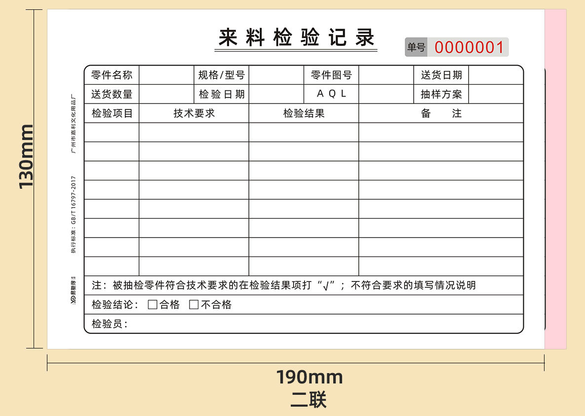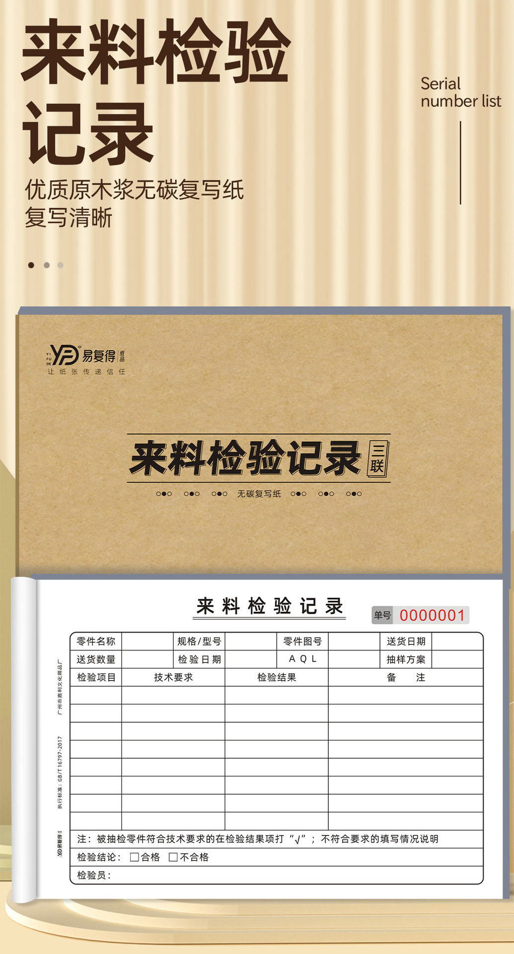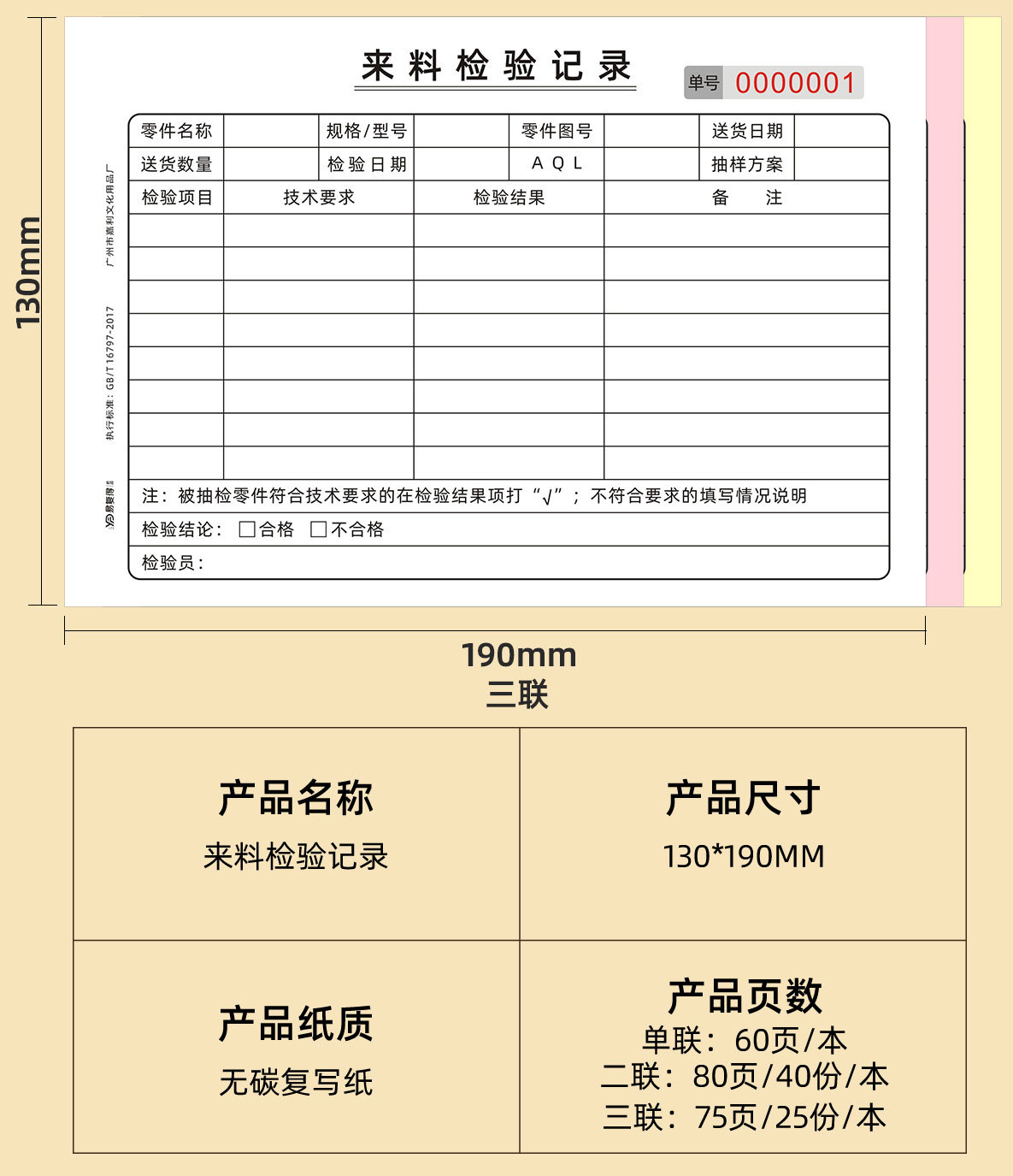 カラー 【単票】入荷検査記録【片面60枚】1冊,【2部】支給材料検査記録【80ページ、40部】1冊,【三聯】支給材料検査記録【75ページ25部】1冊,【二联】品質検査報告書【80ページ40部】1冊,【三聯】品質検査報告書【75ページ25部】1冊,【単票】初回検査・抜き取り検査記録表【片面60枚】1冊,【2部構成】初回検査・抜き取り検査記録表【80ページ、40部】1冊,【単票】不良品処理票【片面60枚】1冊,【二联】不合格品処理書【80ページ40部】1冊,【三聯】不合格品処理書【75ページ25部】1冊