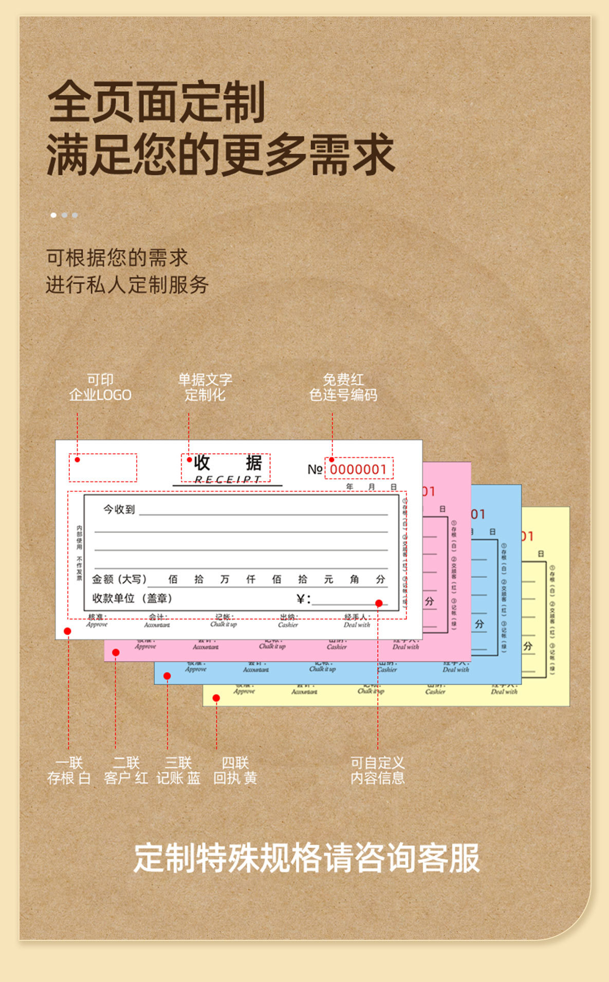 二連単欄領収書本三連多欄入金手形現金精算伝票無炭素複写紙メーカーがカスタマイズした
