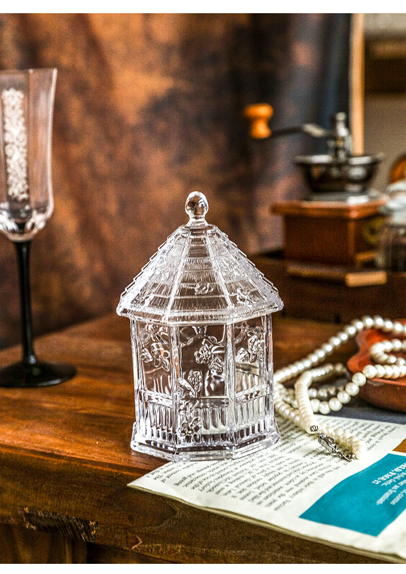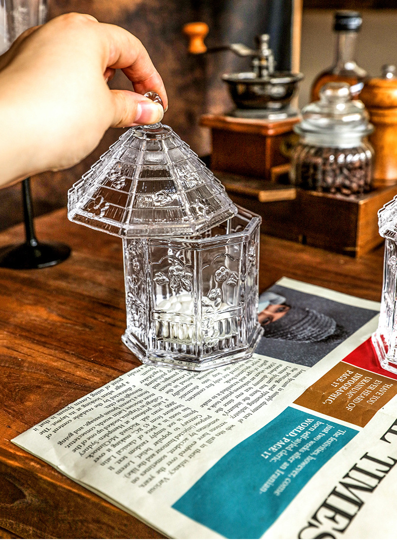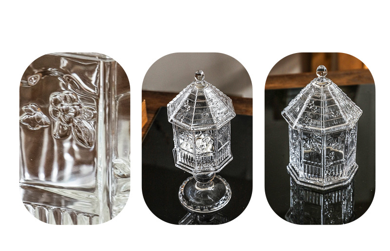 ガラスの花の家の収納缶の綿棒はアクセサリーの箱の砂糖の缶の砂糖のかめの浮き彫りの蝶の花の台所の貯蔵物を収納します。