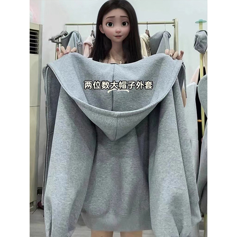 灰色连帽秋冬卫衣外套女秋季女款虞-书/欣同款大帽子开衫重磅上衣