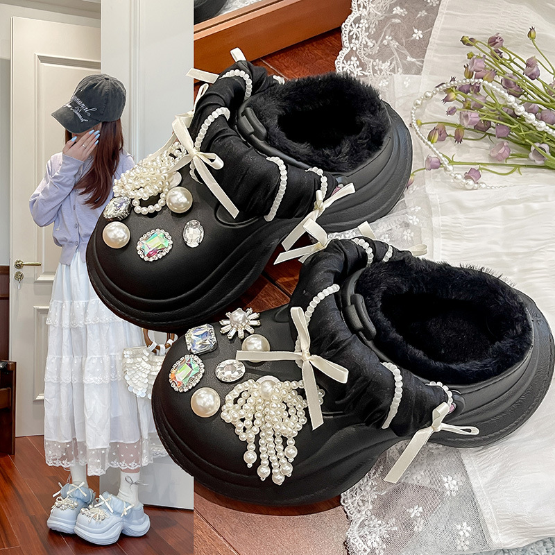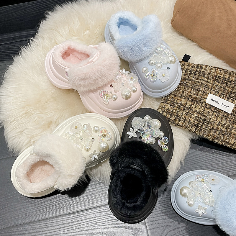 2025秋冬新款甜美风花朵珍珠加绒棉拖鞋女增高外穿保暖两穿洞洞鞋