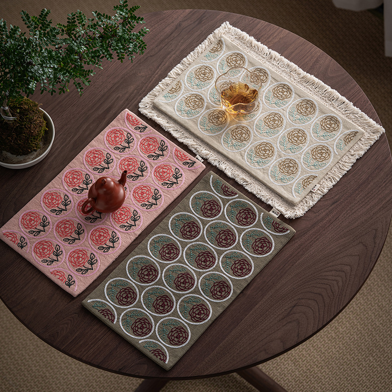 手作刺子绣茶席创意玫瑰干泡垫复古粗布双层茶垫中式茶桌隔热垫子