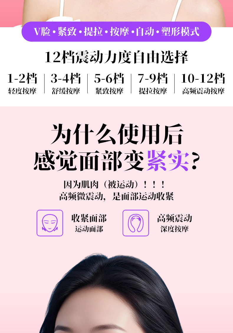 国境を越えたVフェイスマッサージ器、顔のリフトアップと引き締め、顔のたるみ防止、家庭用12段階振動調整可能な美容器