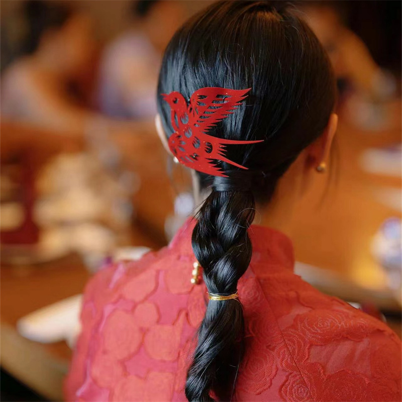 中国式の新婦の頭飾りの赤い九日間の切り紙の玄女の国風のチャイナドレスの喜字の朝の長衣のヘアピンの髪飾りのカササギの形