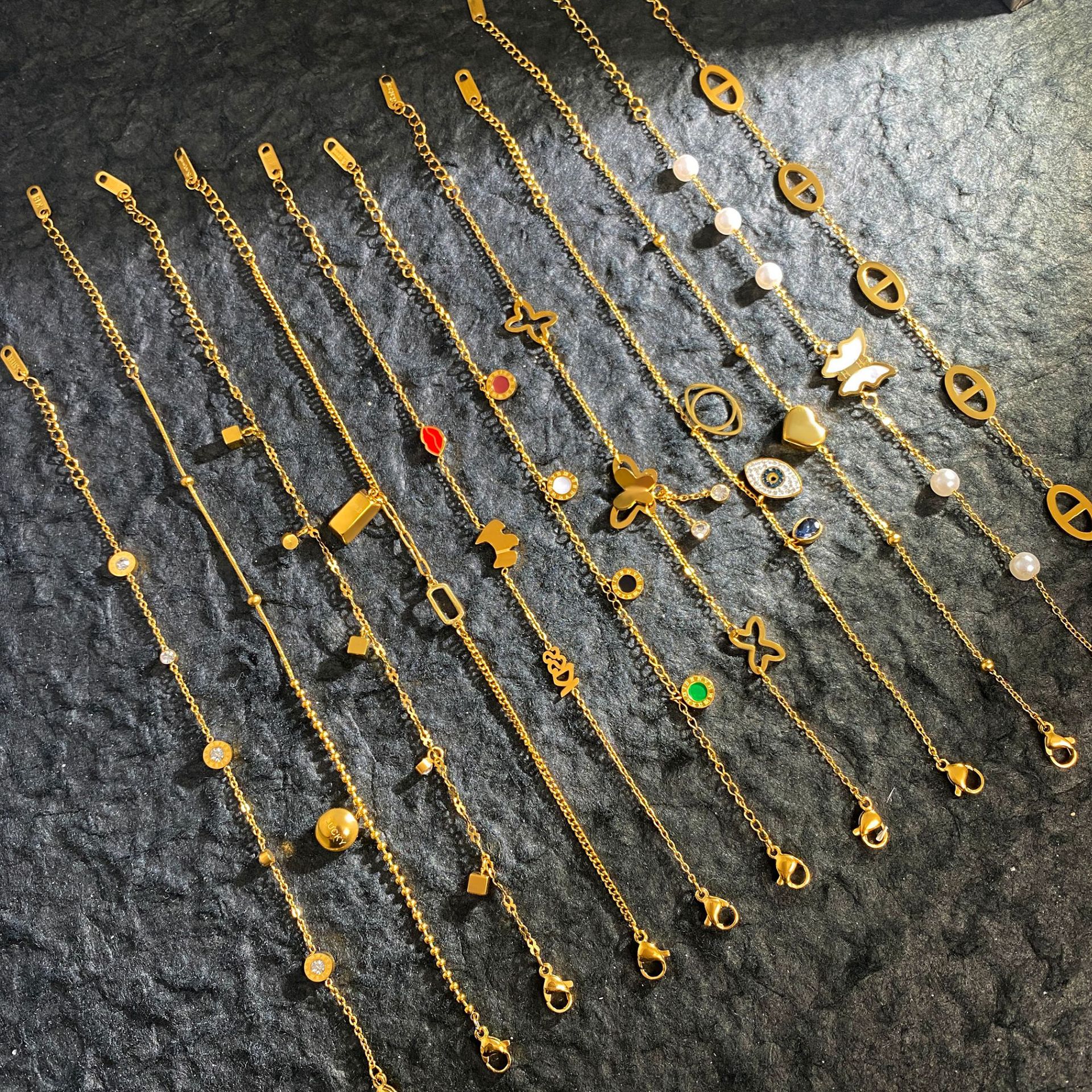 全体に18Kゴールドメッキを施したチタン鋼のブリリアントなプレーンチェーンブレスレット、キラキラ輝くラブハートのシンプルなブレスレット