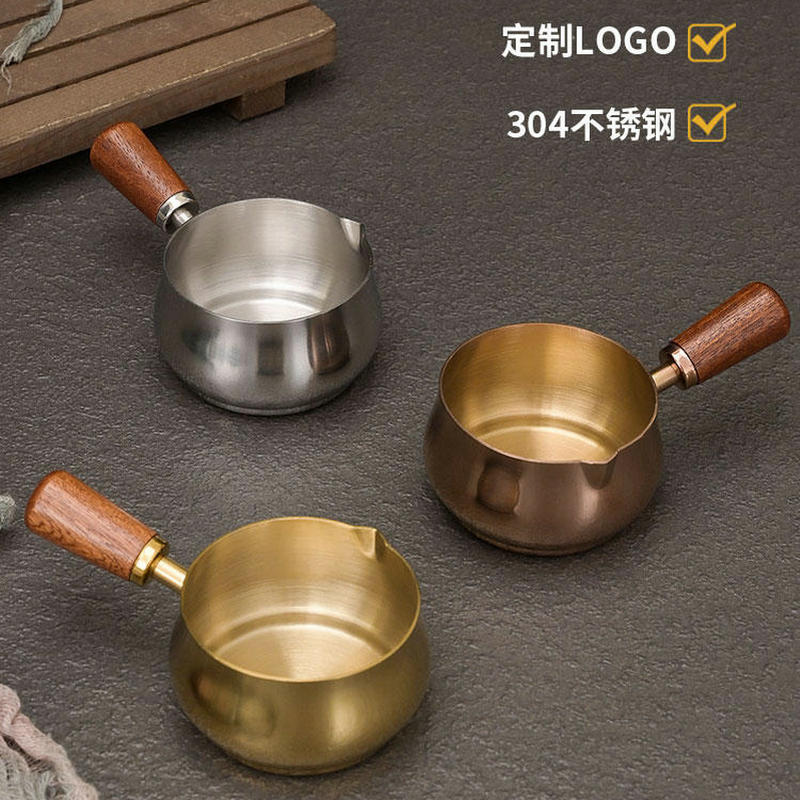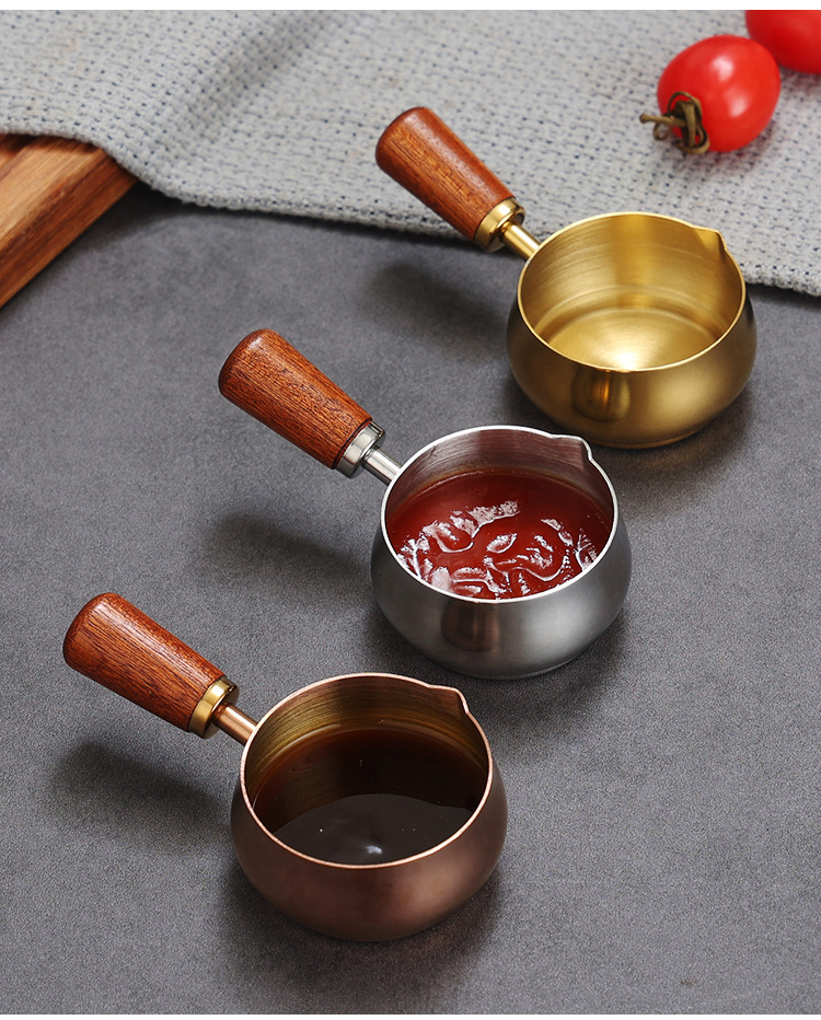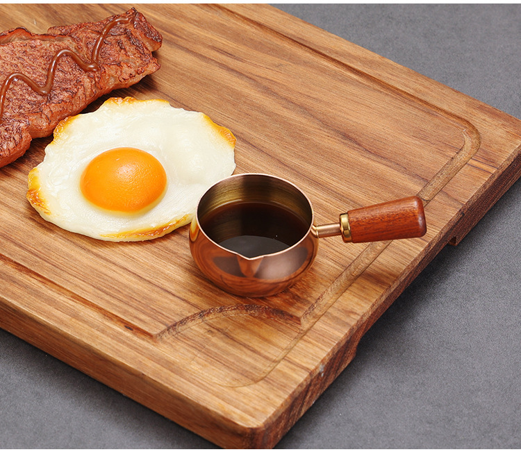 304ステンレスソースカップ洋食ソースカップ牛ステーキ調味料カップ木柄ハンドルトマトサラダにソース皿をつけます。