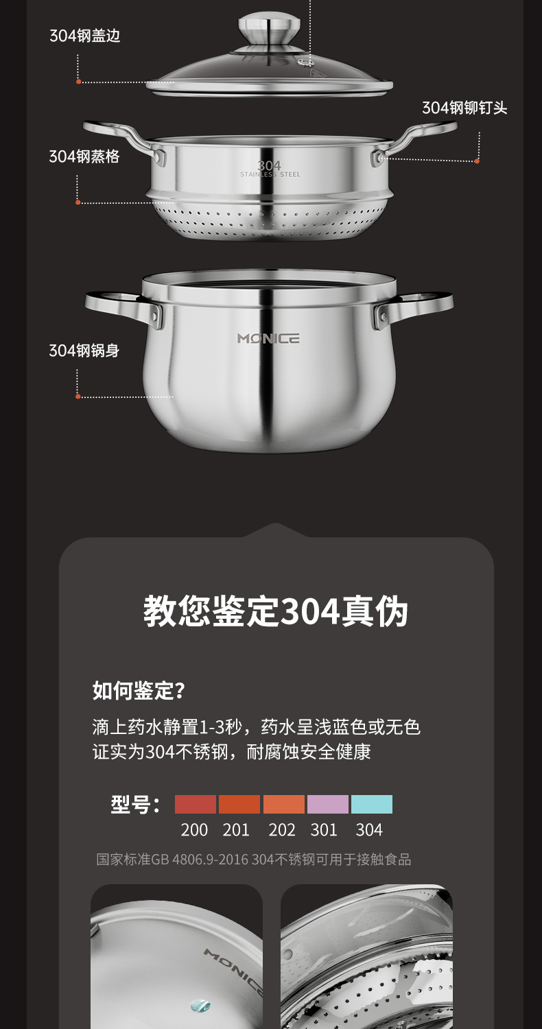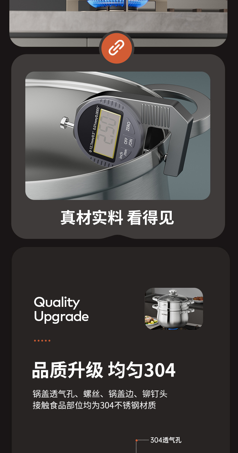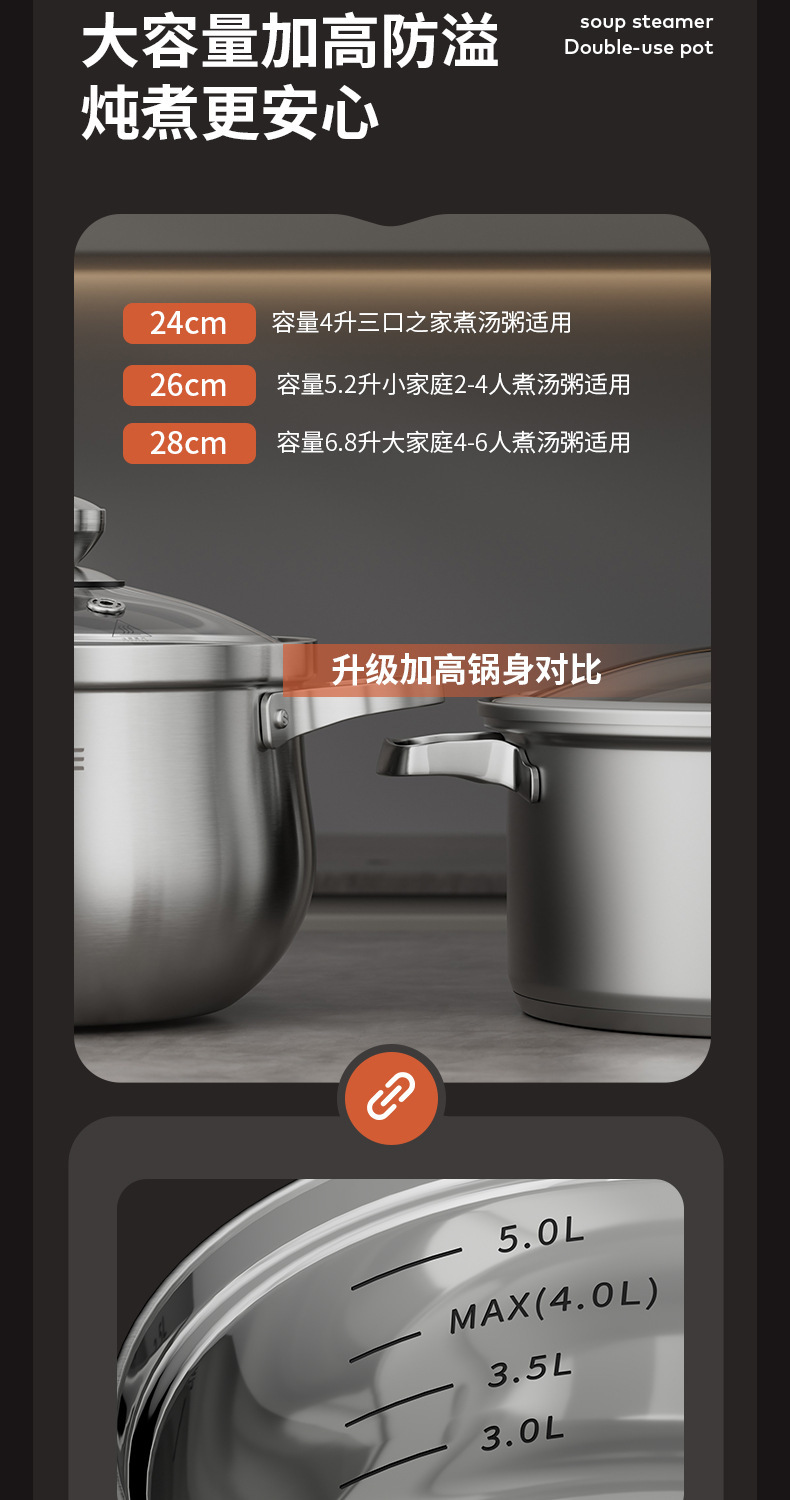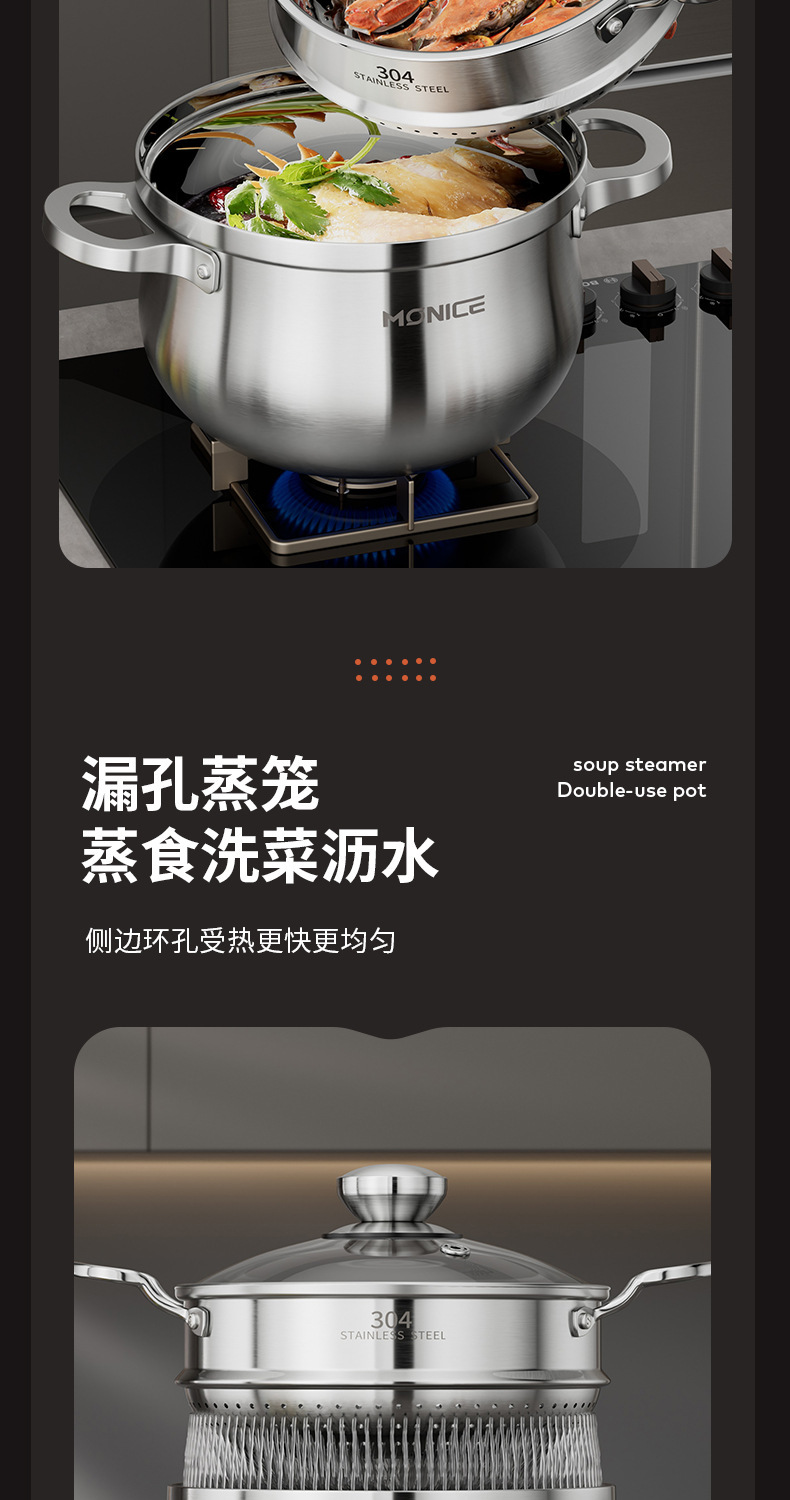 ステンレス製スープポット304三層鋼膨張型防溢蒸し調理麺鍋スープ大容量鍋蒸し調理両用
