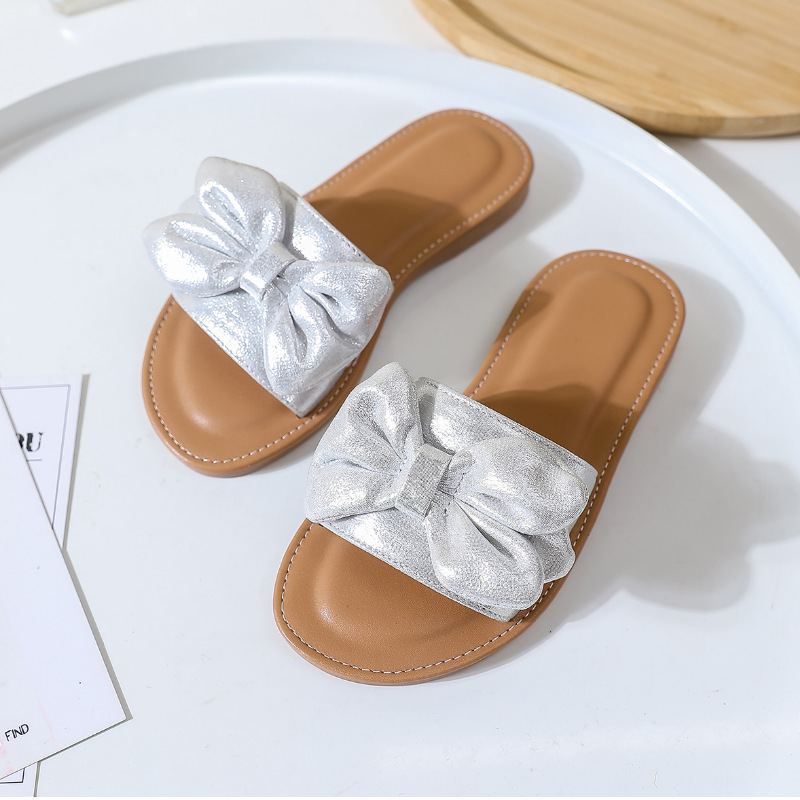 クロスボーダー2023夏の新型銀色滑り止め一字の蝶結びの女の子の子供のフラットスリッパの対外貿易