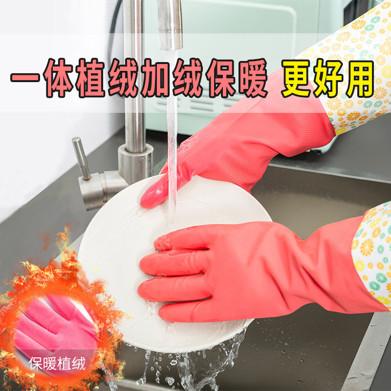保温とベルベットの厚い一体植毛冬ゴムラテックスの長い洗濯手袋家事台所の皿洗い手袋