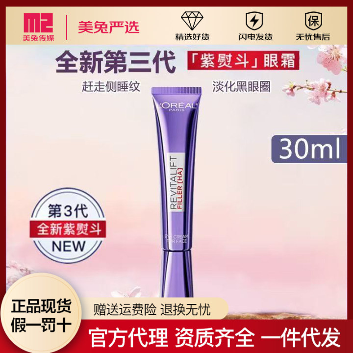 欧莱雅复颜玻尿酸水光充盈全脸淡纹眼霜第三代紫熨斗保湿提拉紧致