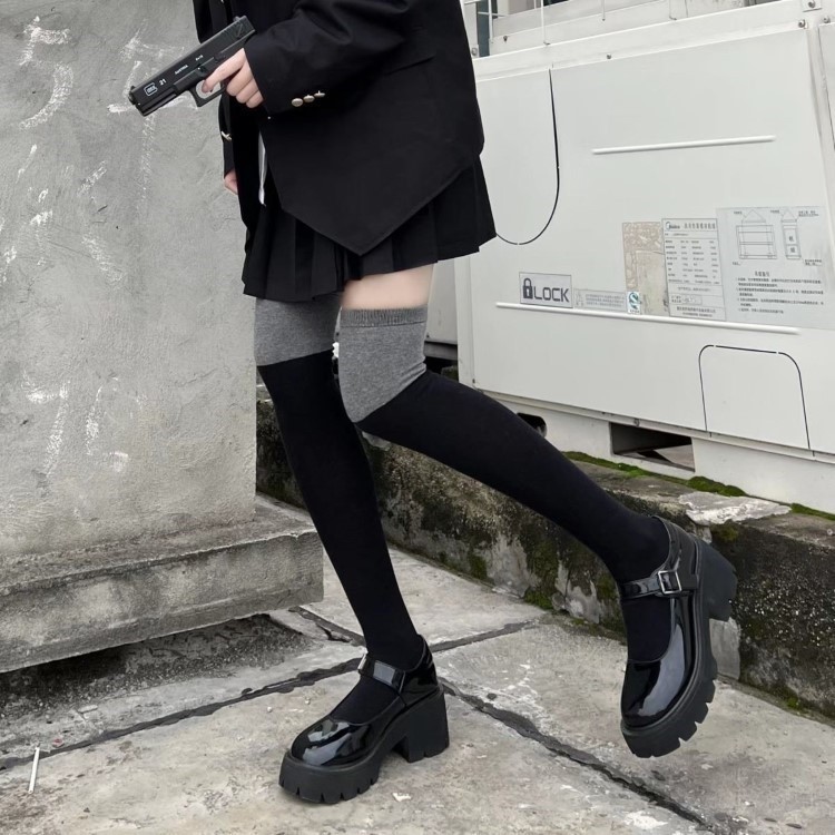 黒い灰色の色合わせの膝の靴下の子供の秋冬のタイプの中筒の黒いふくらはぎの靴下の純欲の高い筒の膝の長い筒の靴下