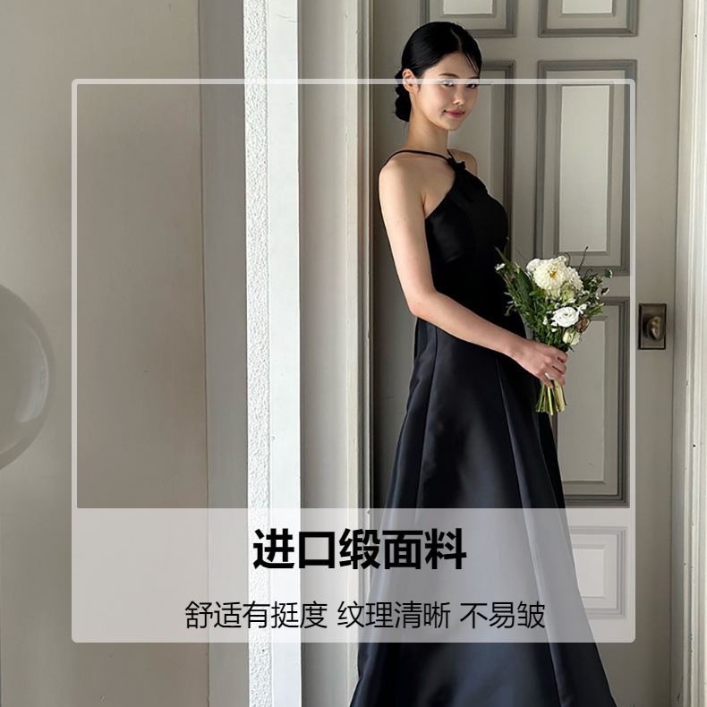 韓国ヘップバーンスタイルのイブニングドレス、誕生日宴会、エレガントなセレモニーホスト、ホルターネック、バックレス、ブラックフィッシュテール、スモールトレイン