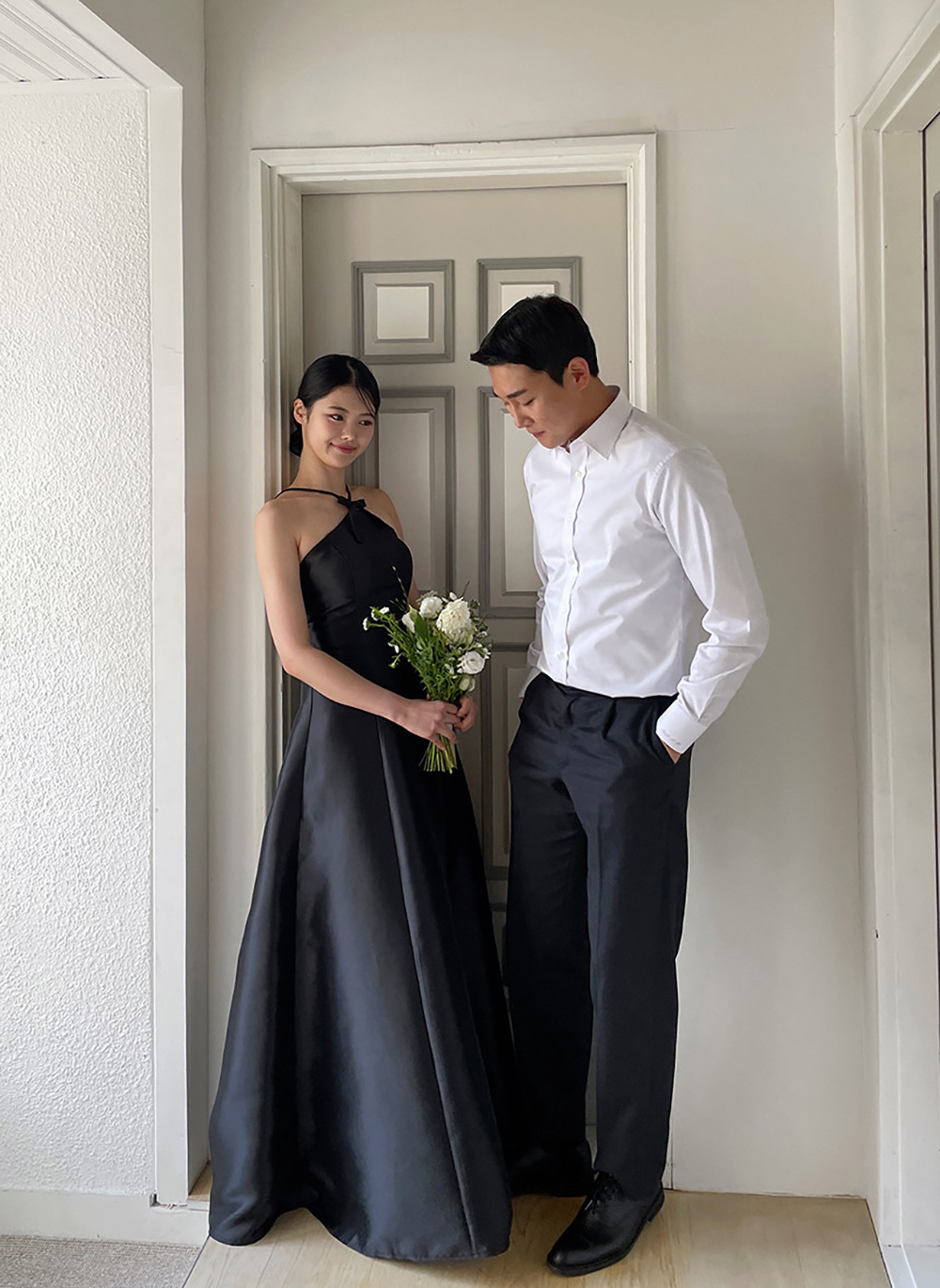 フランス式の軽いウェディングドレスの黒いサテンのヘボン風の影楼のテーマのカップルの写真の蝶結びの領収書の登録の小さいドレス