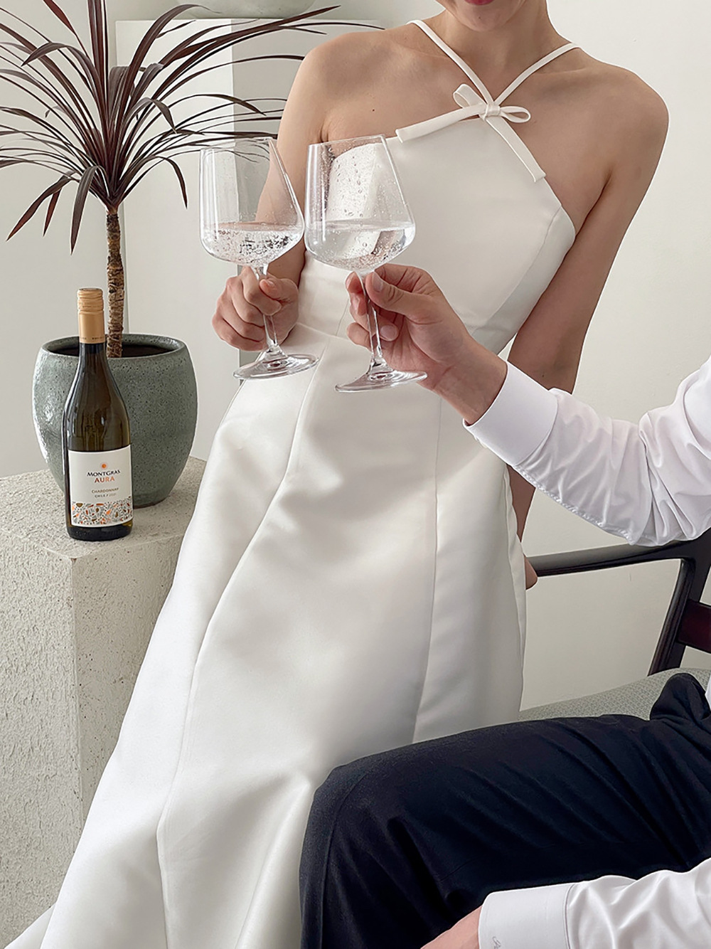 韓国風ライトウェディングドレスオーガンザスーパーフェアリーホルターネックリボンシンプルな気質エレガントな宴会ホストイブニングドレスフレンチスタイル