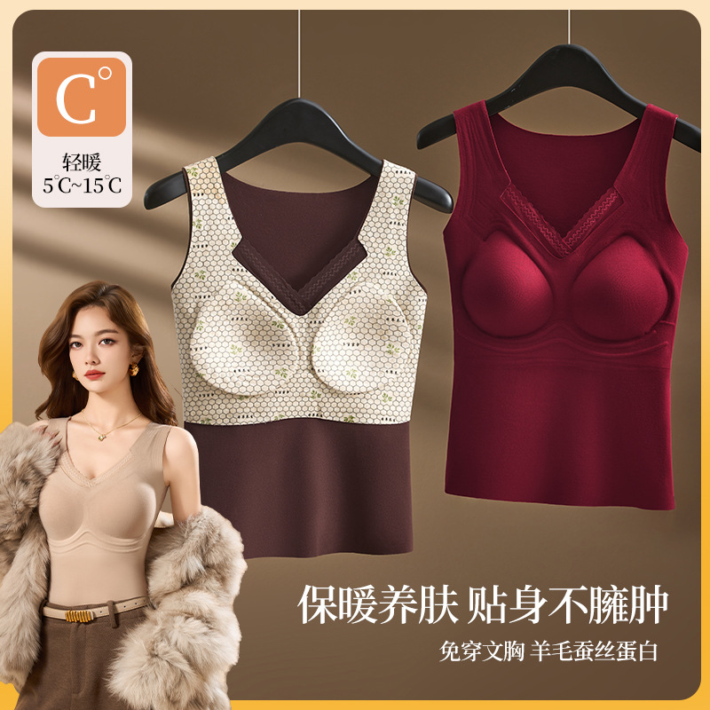 保暖背心女羊毛绒蚕丝内衣加绒加厚带胸垫蓄热冬季内穿无痕打底衫
