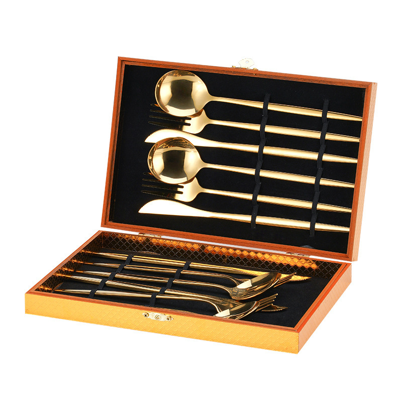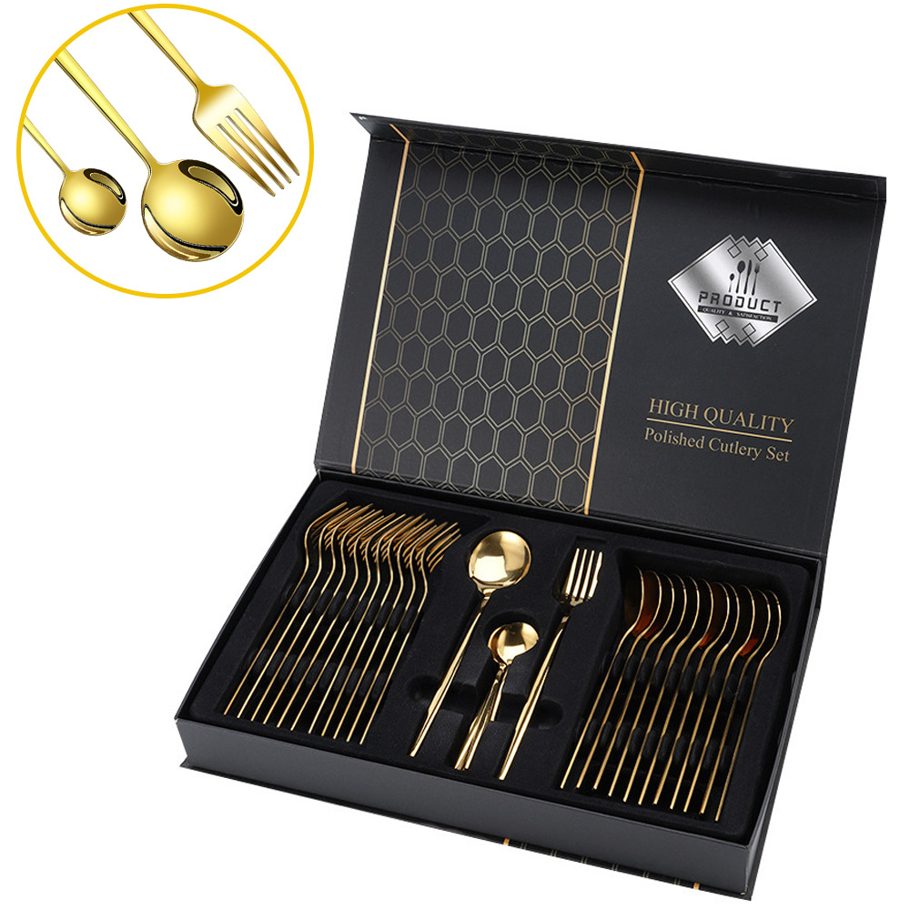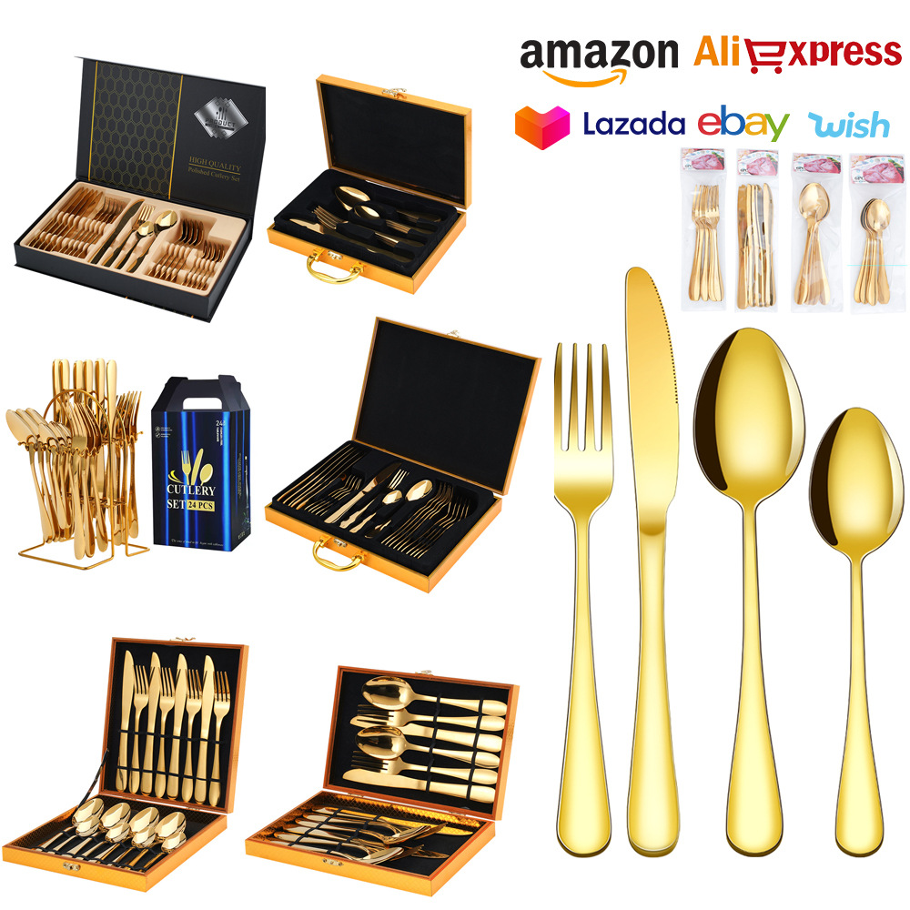 クロスボーダーステンレス食器ナイフフォークスプーン24点セットゴールド色収納棚洋食ステーキギフトボックスセット