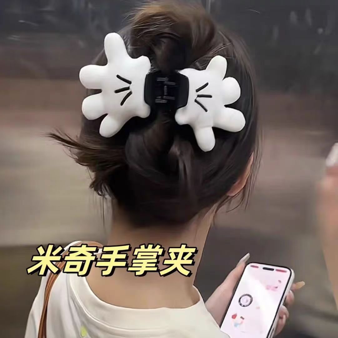かわいいアニメのミッキーの手のひらは甘い少女の髪を挟みます。