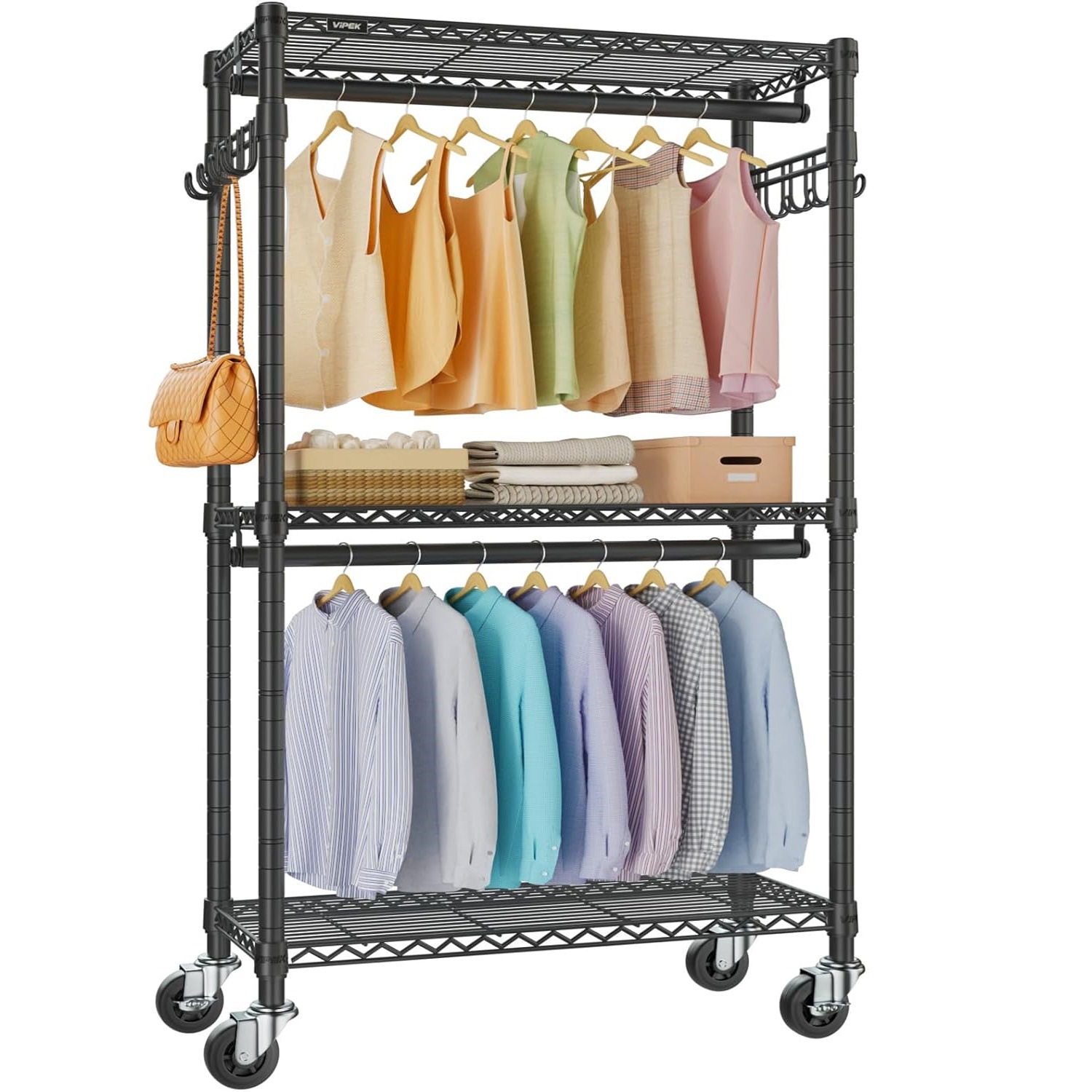 开放式衣架大容量可调节带轮子卧室碳钢竹接管置物架组合简易货架
