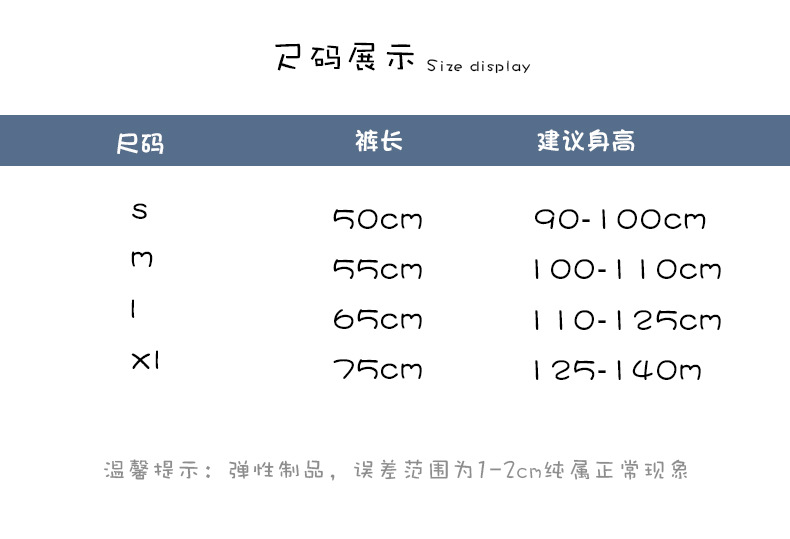 Sズボンの長さ50は身長90-100を提案します。,Mズボンの長さ55は身長100-110を提案します。,Lズボンの長さ65は身長110-125を提案します。,XLズボン長75は身長125-140を提案する