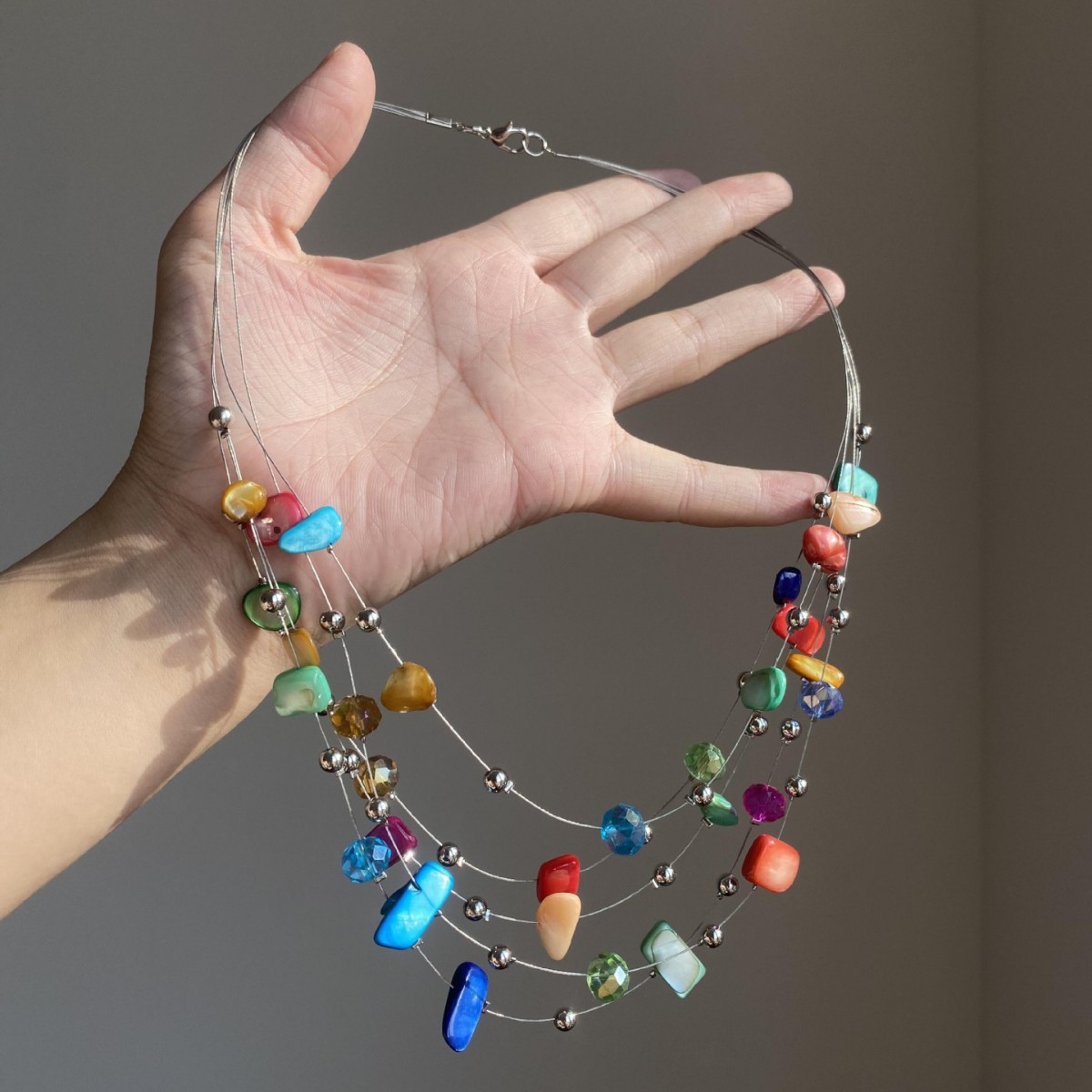 波西米亚度假风彩色碎石串珠项链独特夸张多层环绕锁骨链重工颈链