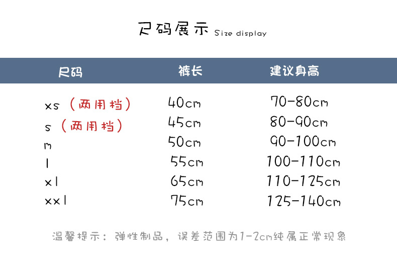 XS (両用) ズボンの長さ40は身長70-80を提案します。,S (両用) ズボンの長さ45は身長80-90を提案します。,Mズボンの長さ50は身長90-100を提案します。,Lズボンの長さ55は身長100-110を提案します。,XLズボンの長さ65は身長110-125を提案します。,Xxxlズボン長75は身長125-140を提案する