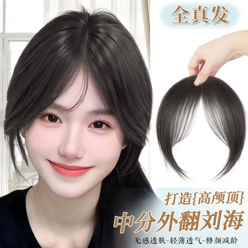 女性用の8の字前髪ウィッグ、完全な本物の髪、自然な額の偽前髪、シームレスな空気胎児毛、中間分けウィッグ