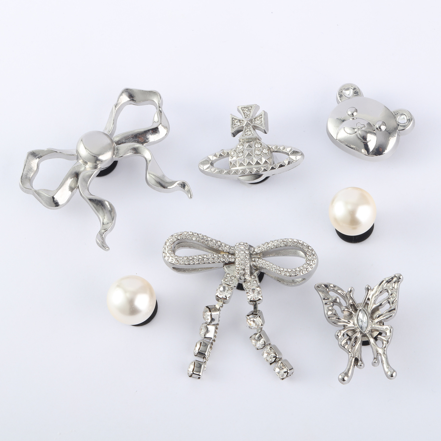 跨境热新款商场洞洞鞋花蝴蝶结银色链条珍珠镶钻小红书同款扣配件