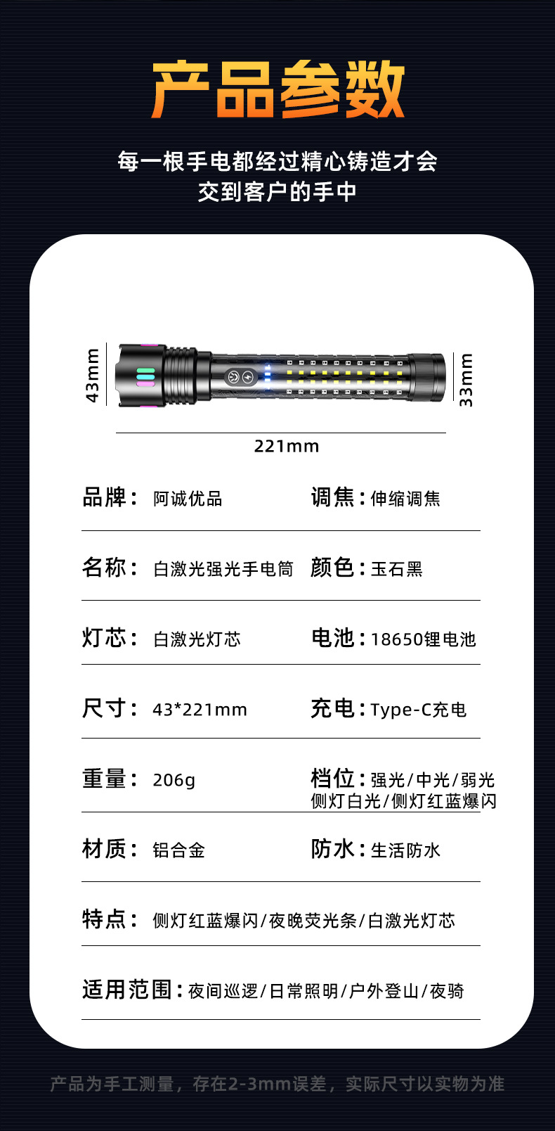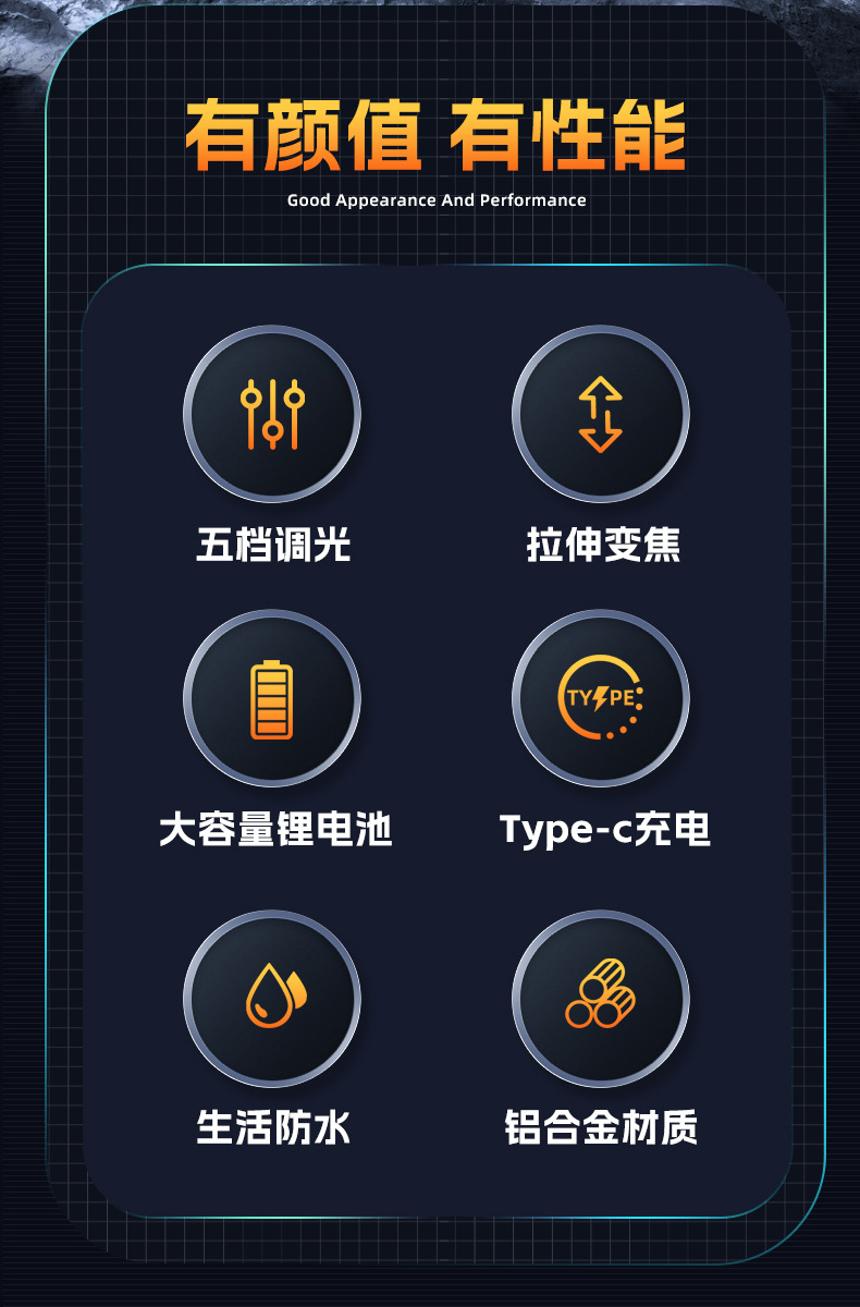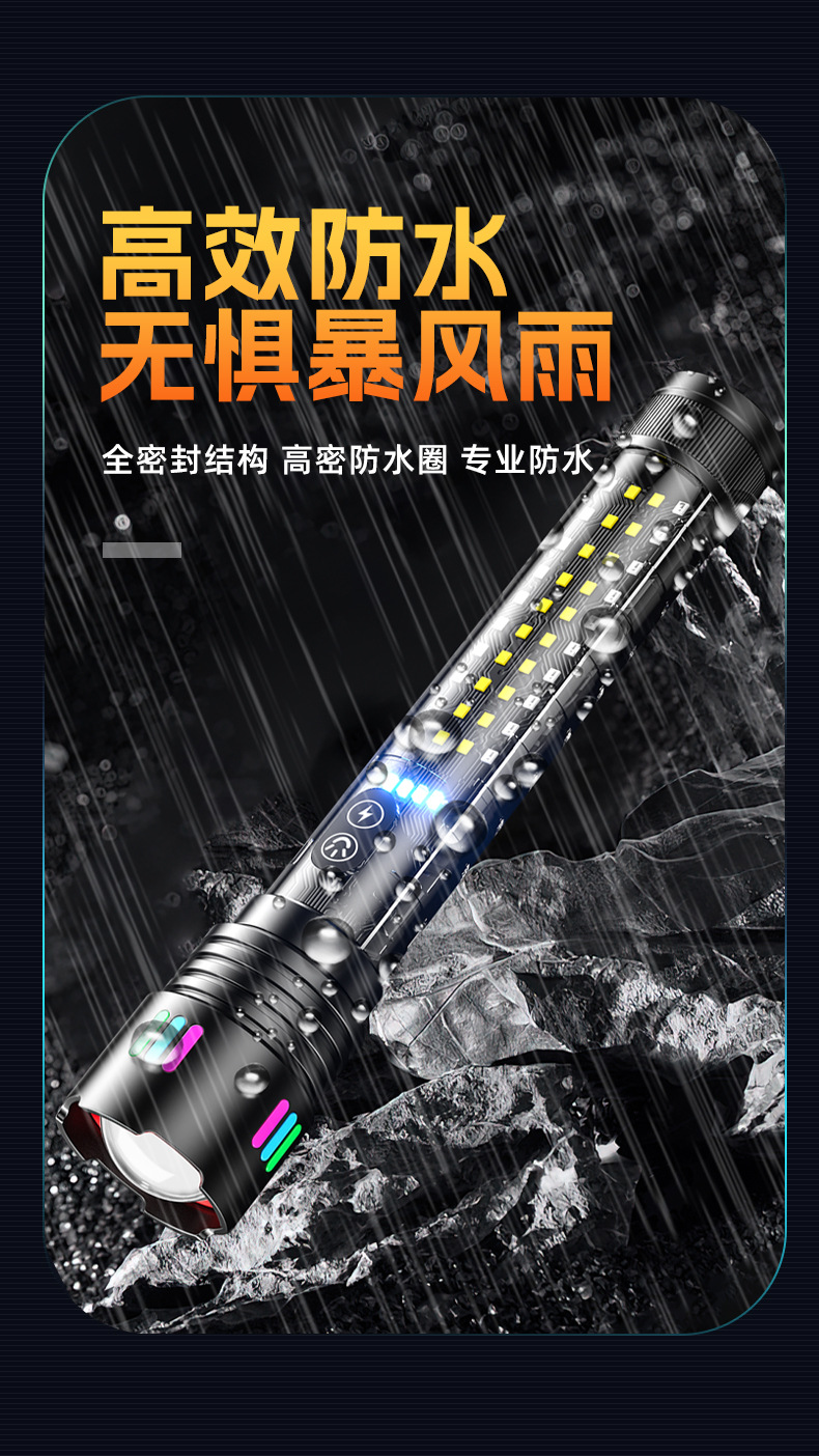 6.公司手电筒具有生活防水能力,一般雨淋不会出现问题,但不具备潜水功能,请勿携带此手电筒潜水或长时间放在水盆,浴缸里;