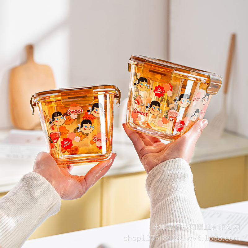 厚いガラスの弁当箱の不二家はマイクロ波の四角形の新鮮な碗の家庭用の新鮮な箱の漫画の学生の弁当箱ができます。