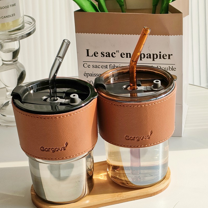高颜値竹節杯コーヒーカップネット赤ins風飲料グラス蓋付き軽贅沢皮カバー直飲カップ