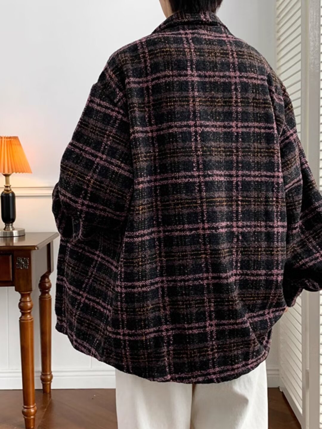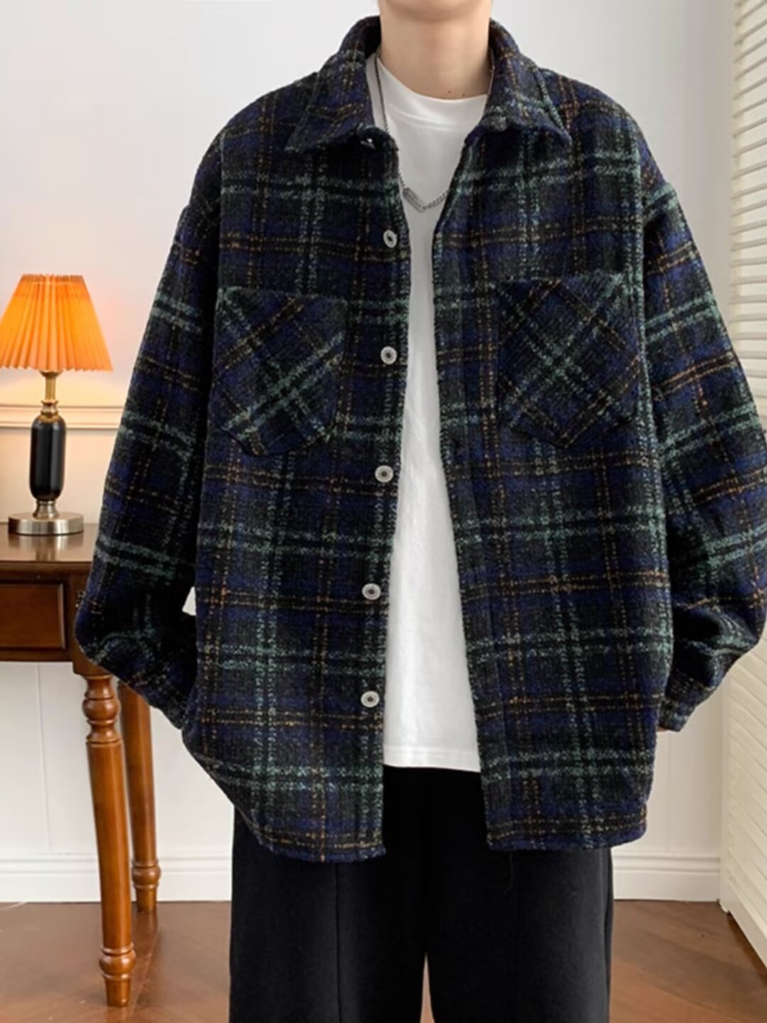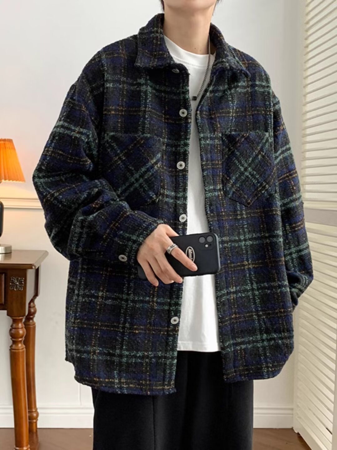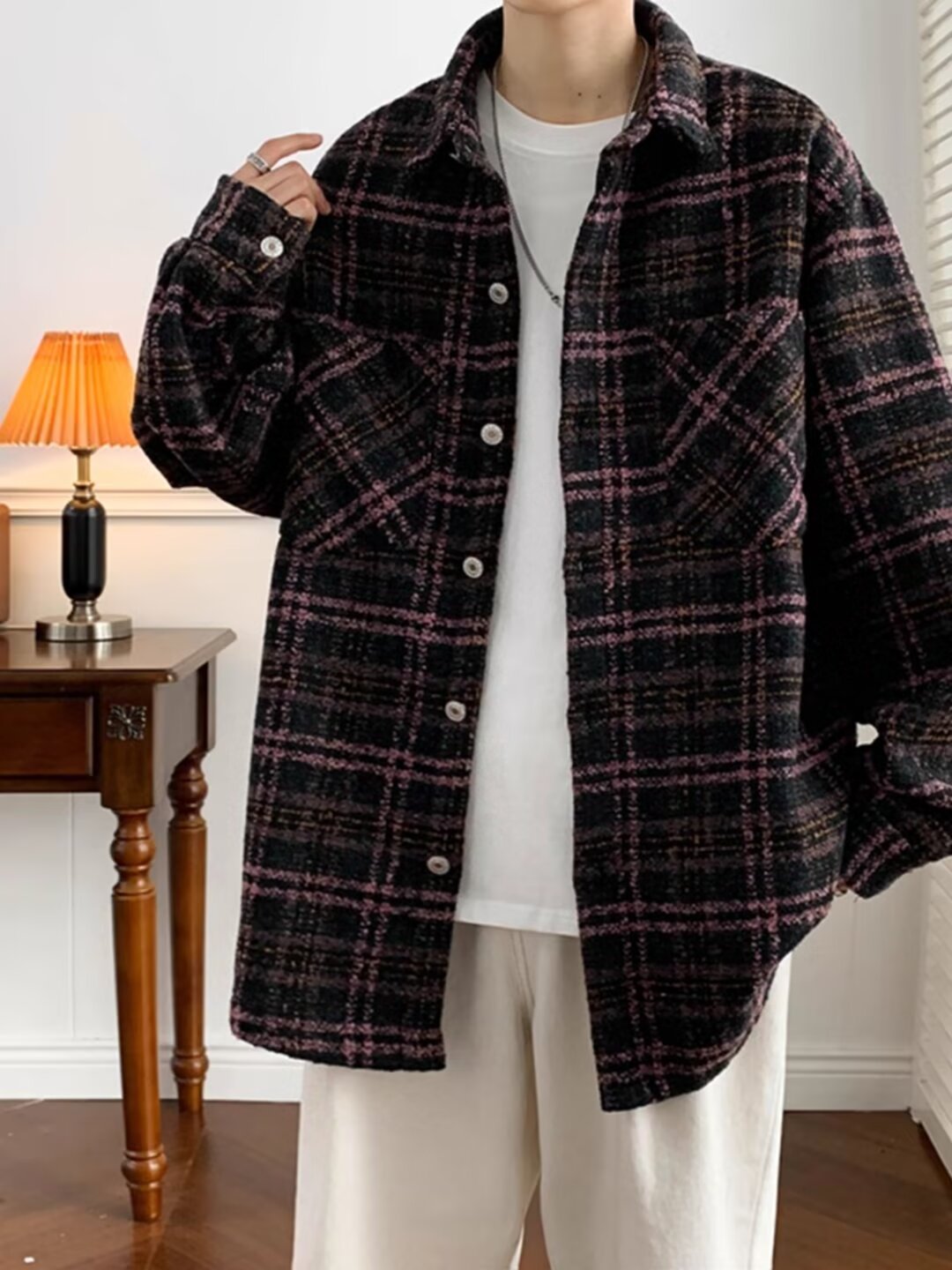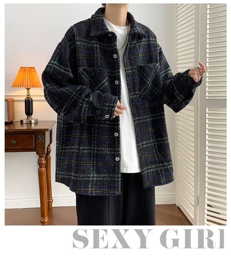 日系レトロ高級感コート男春秋新作小香風格子シャツジャケット潮牌カップル服男