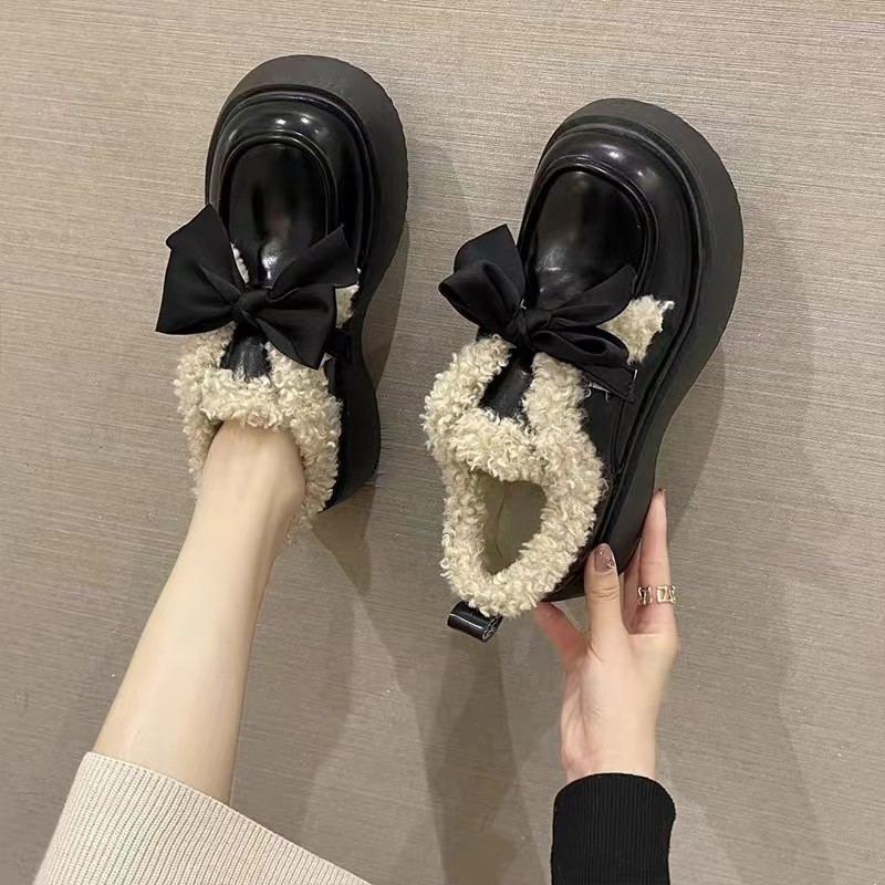 大きい頭の蝶結びの黒いベルベットの小さい靴の女性の冬の英倫風の日本の保温の厚い底jkメアリー珍の綿の靴