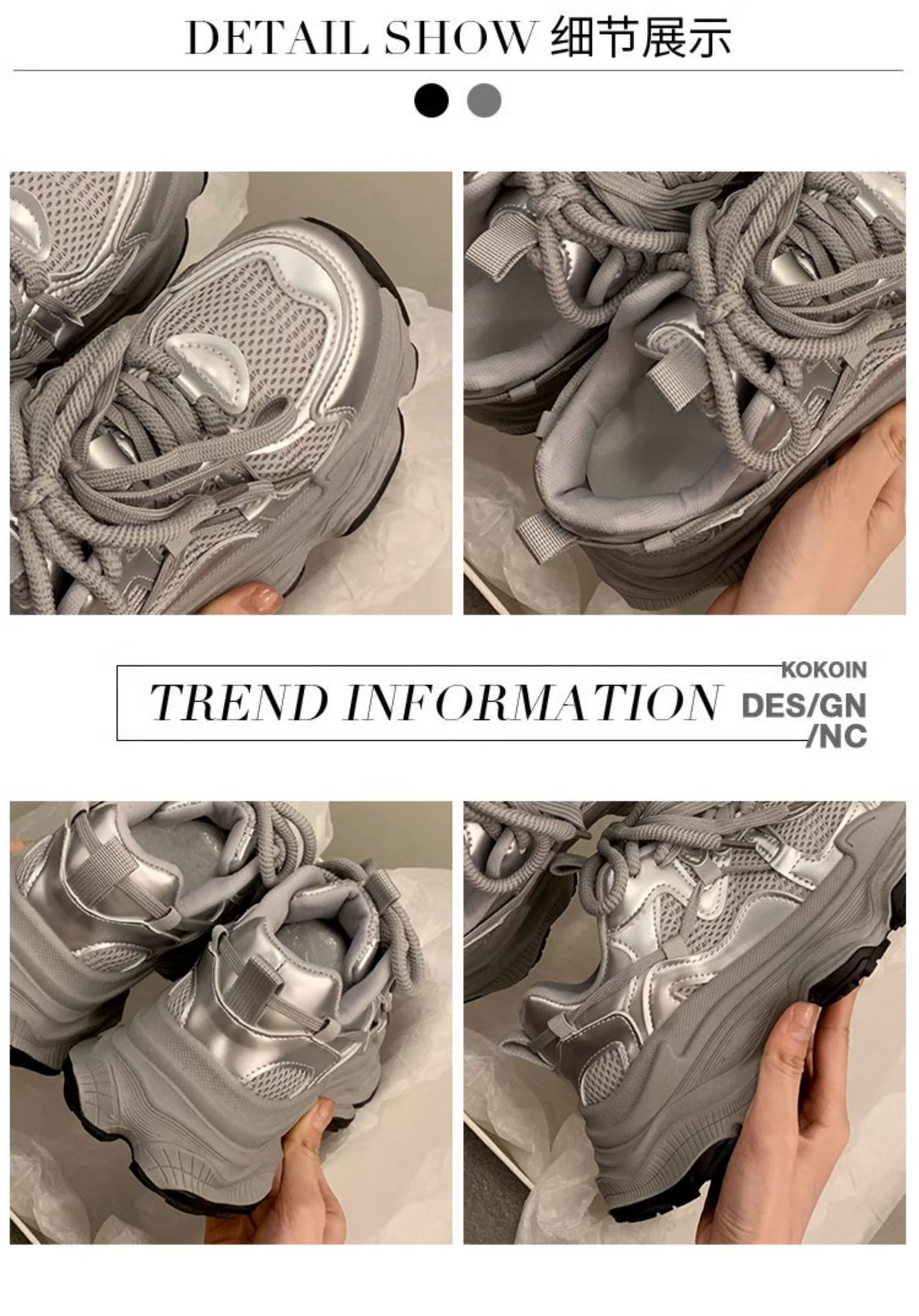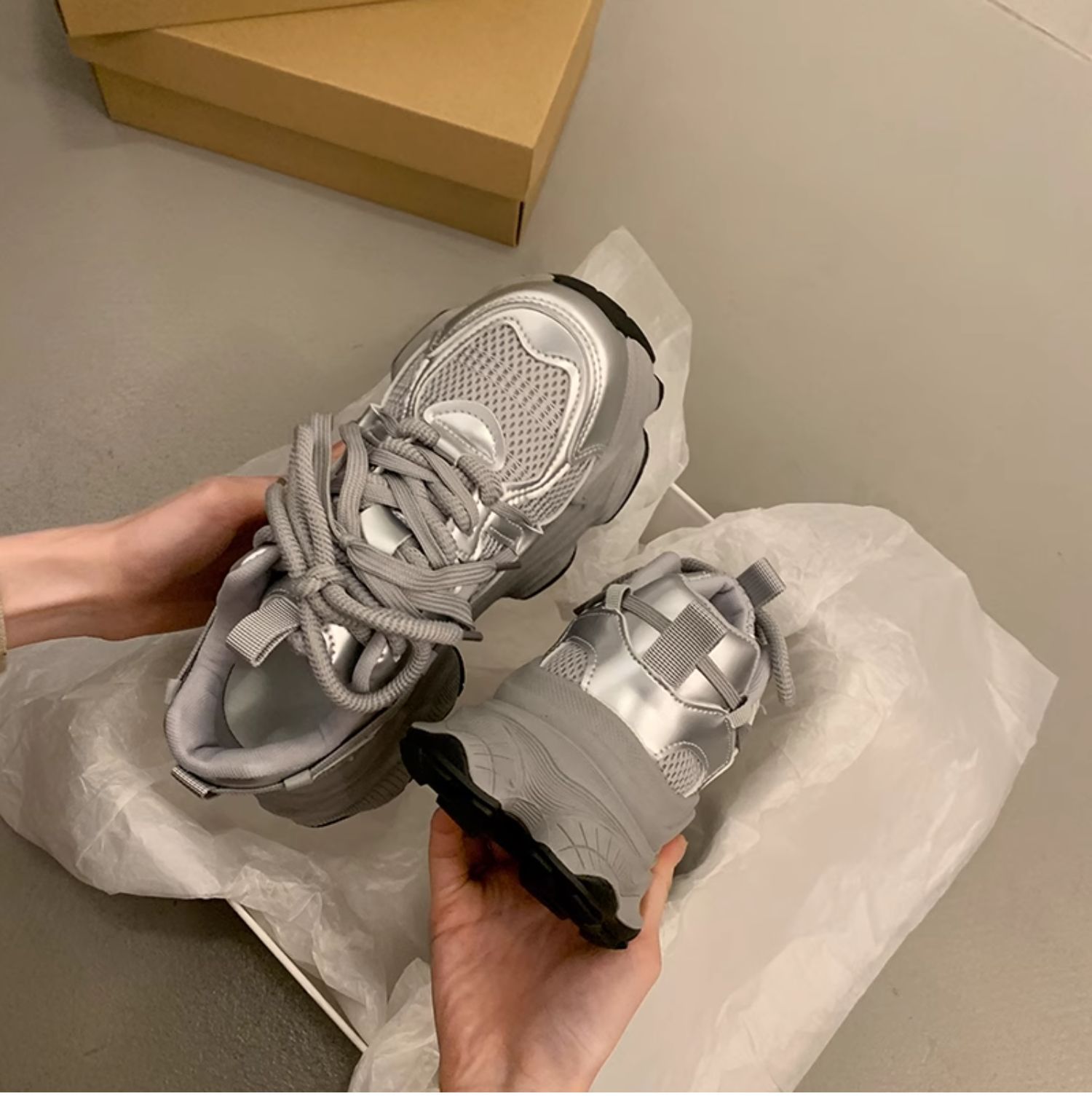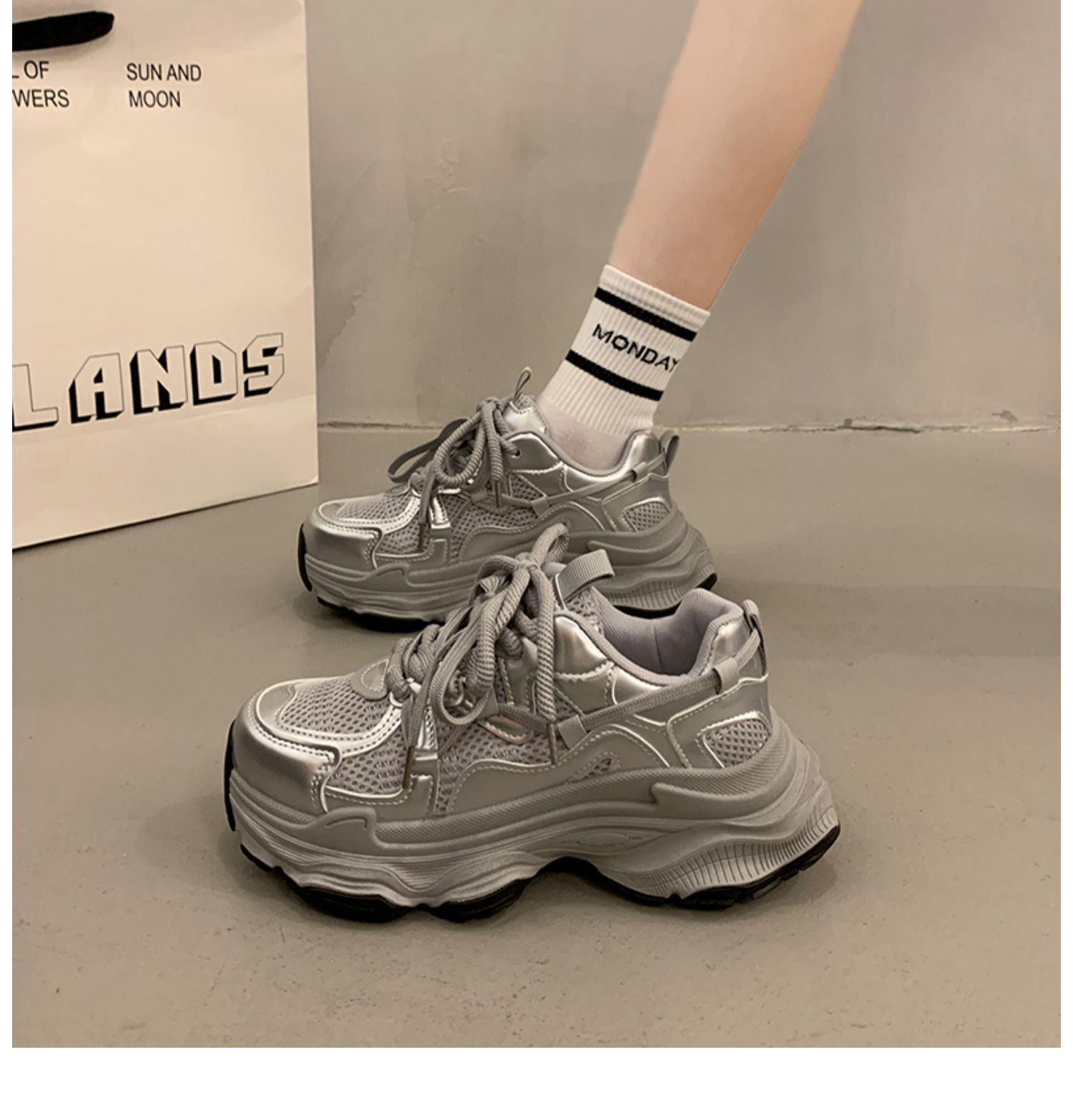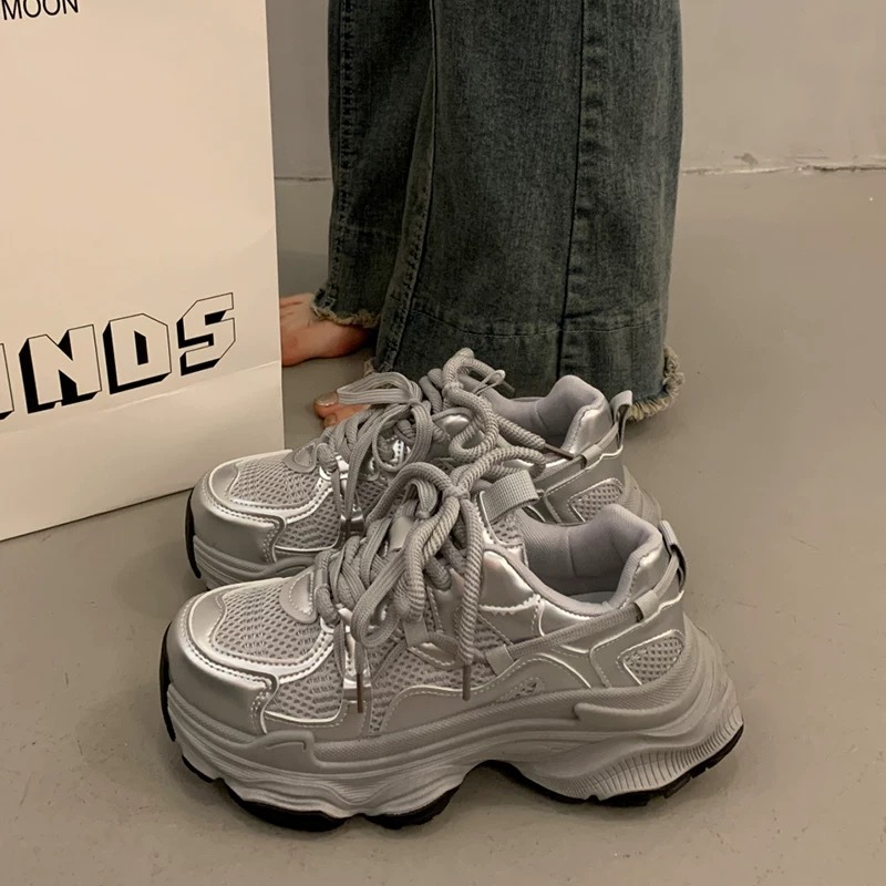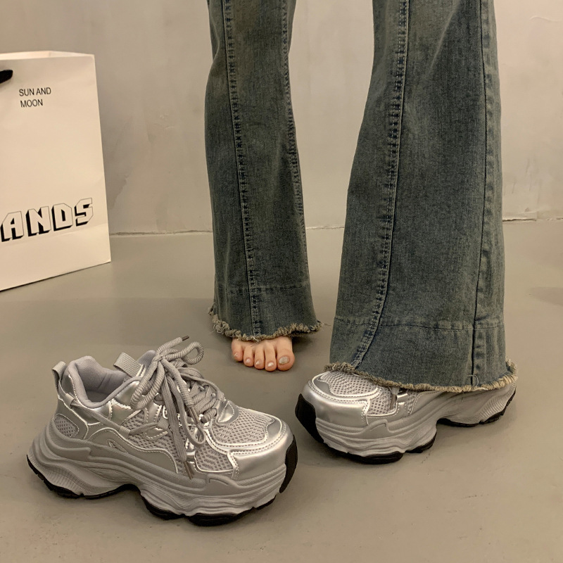 厚底ダッドシューズレディース2025春秋新作メッシュ通気性レディースシューズシルバー高めカジュアルスポーツシューズ