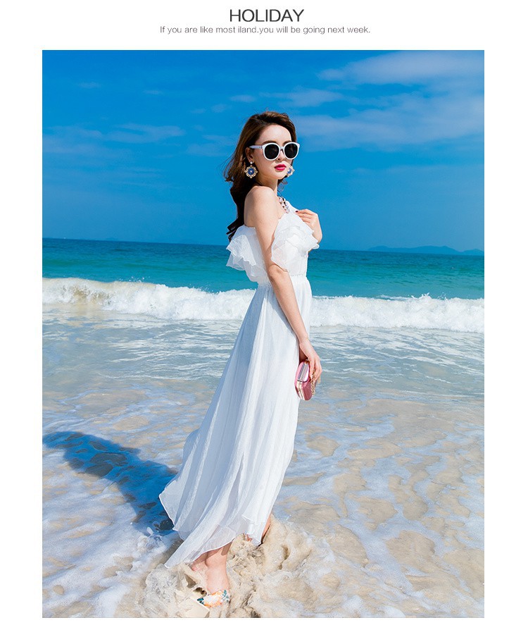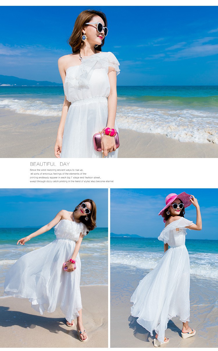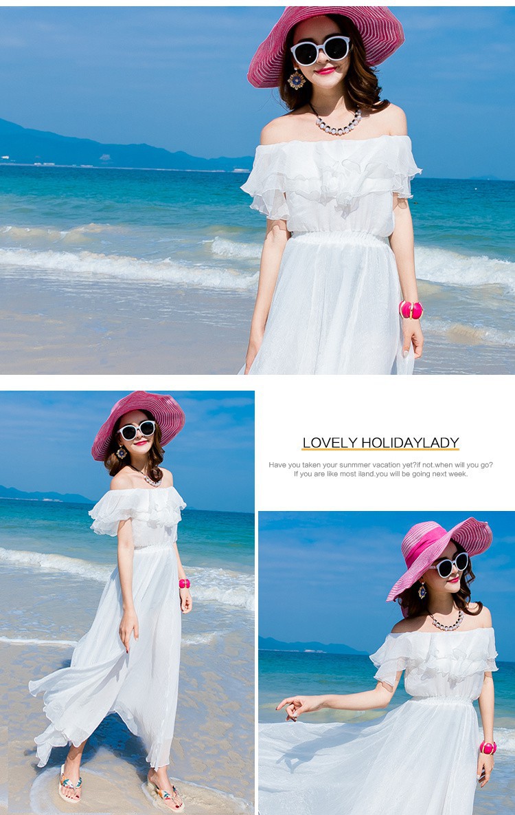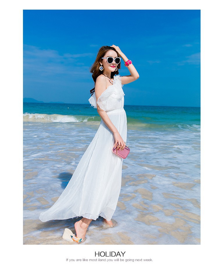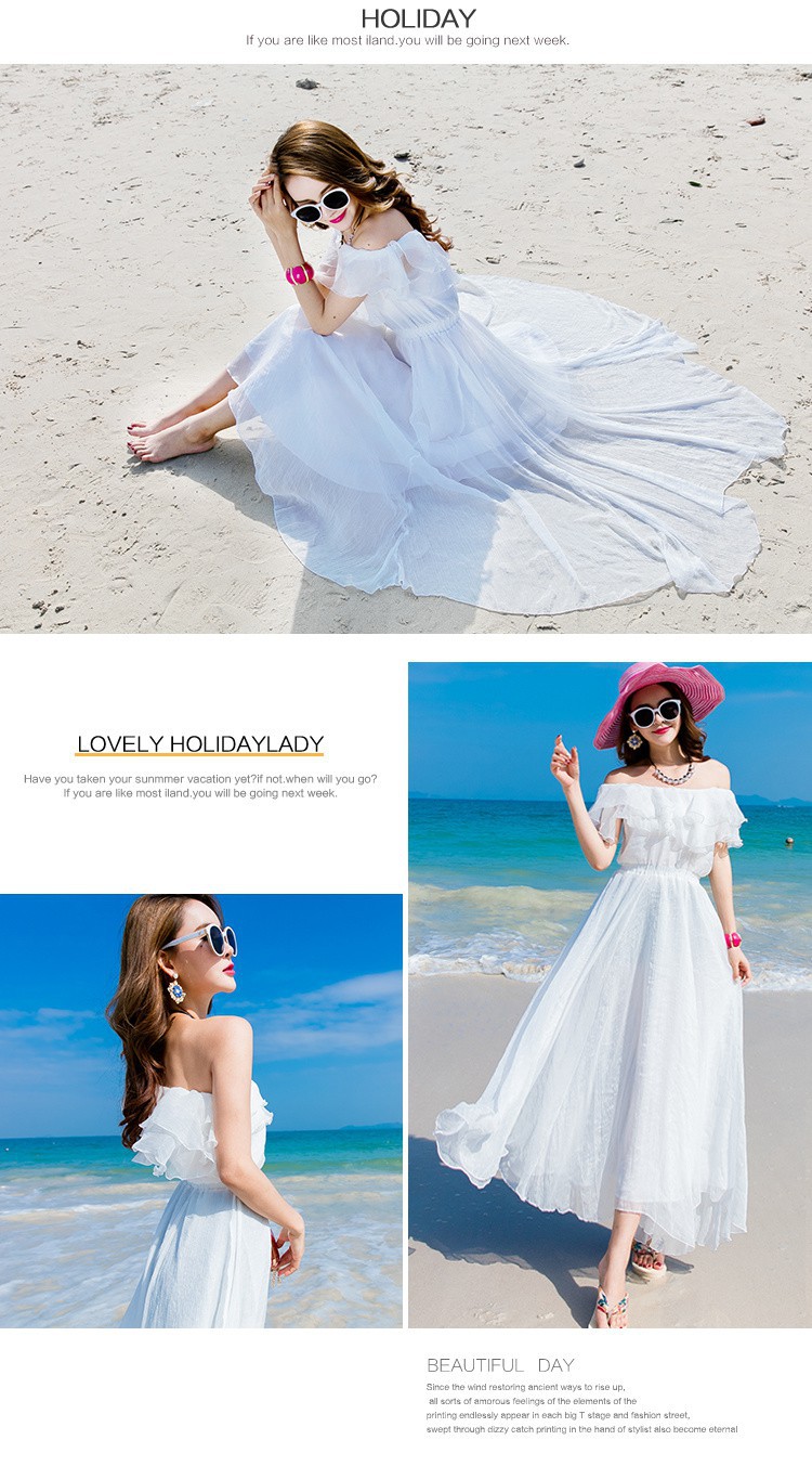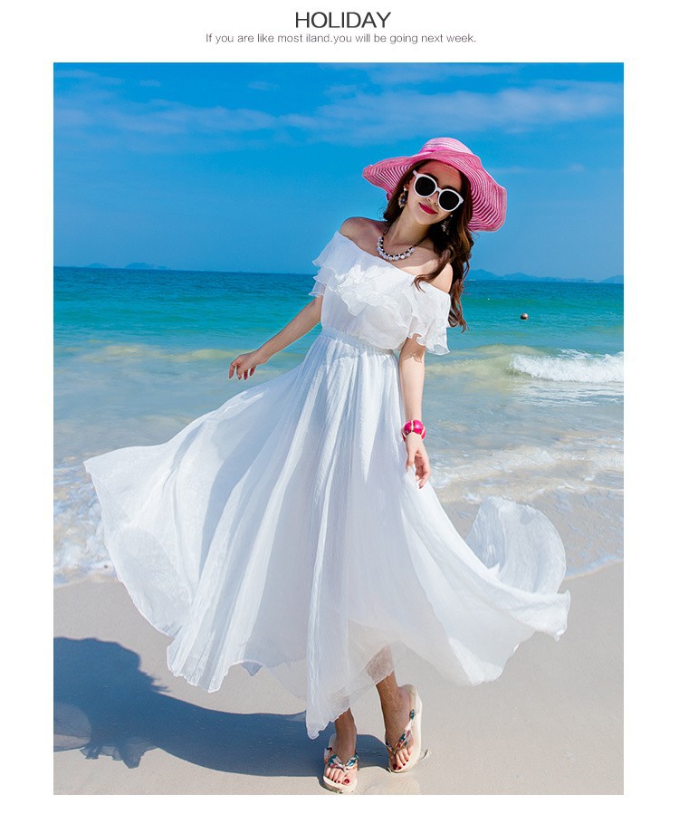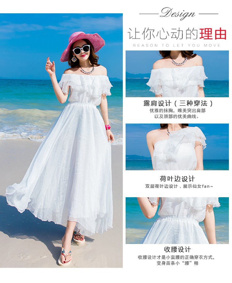 バリ島の休暇のビーチのスカートは肩の1字の肩のワンピースの女性の長い型のシフォンの写真のスカートを収めて腰を収めてやせている学生を現します。