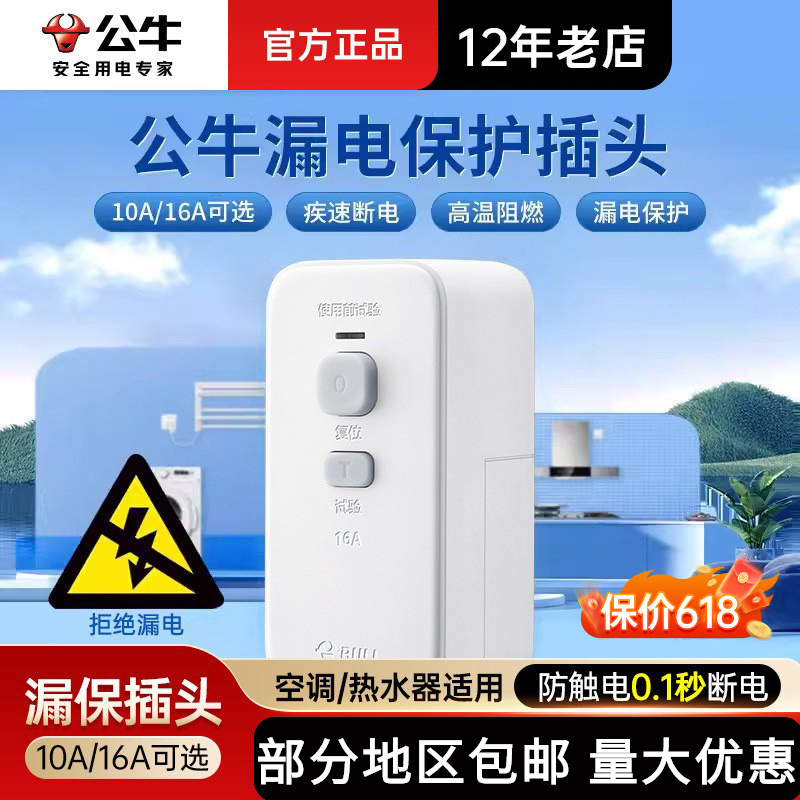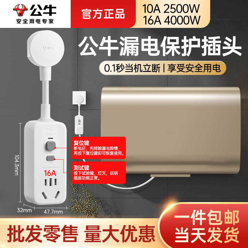公牛防漏电保护器插头16a电热水器专用漏保带开关家用10a漏电插座