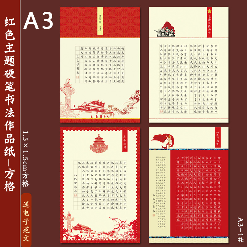 A3硬筆書道作品紙1.5方眼赤色テーマ愛国慶節祖国伴我成長書道試合創
