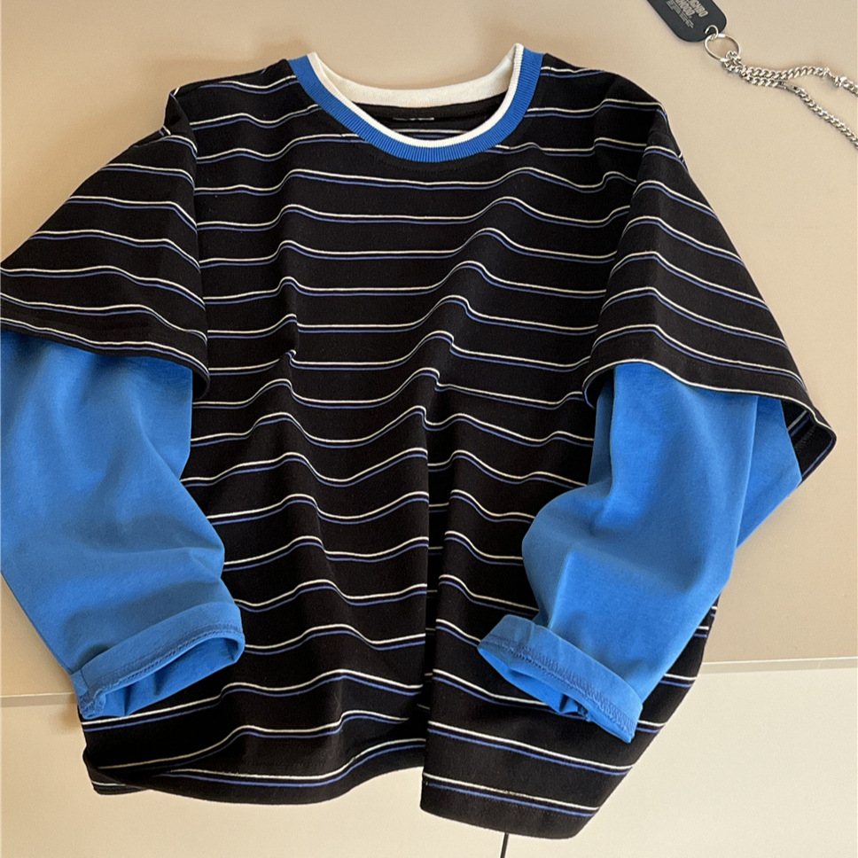 【显白蓝条纹】25秋季韩国童装儿童条纹假两件长袖男童中大童上衣