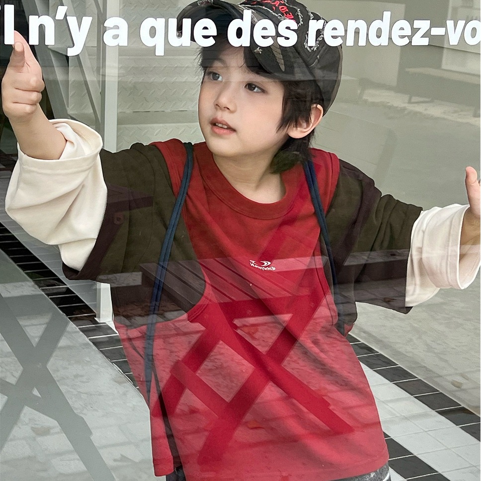 2025年秋子供用フェイクツーピースボトムシャツ、レトロカレッジスタイルの柄入り袖、手描きのペイントが施された男の子用長袖Tシャツ
