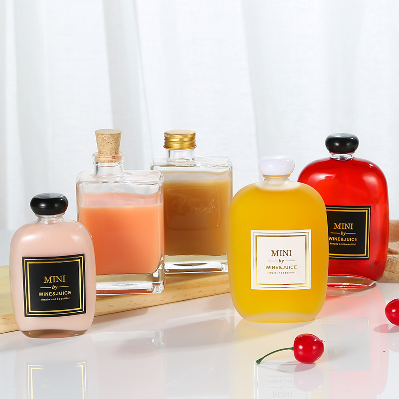 スポットフルーツワインボトル透明ガラスボトル水出し茶傾斜ショルダーフルーツワインボトルクリエイティブアイスワインボトルジュースアルミ蓋ミルクティーボトル