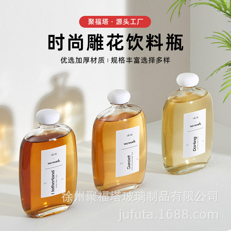 新款250ml扁圆饮料瓶奶茶瓶玻璃磨砂饮料密封半斤自酿果酒白酒瓶