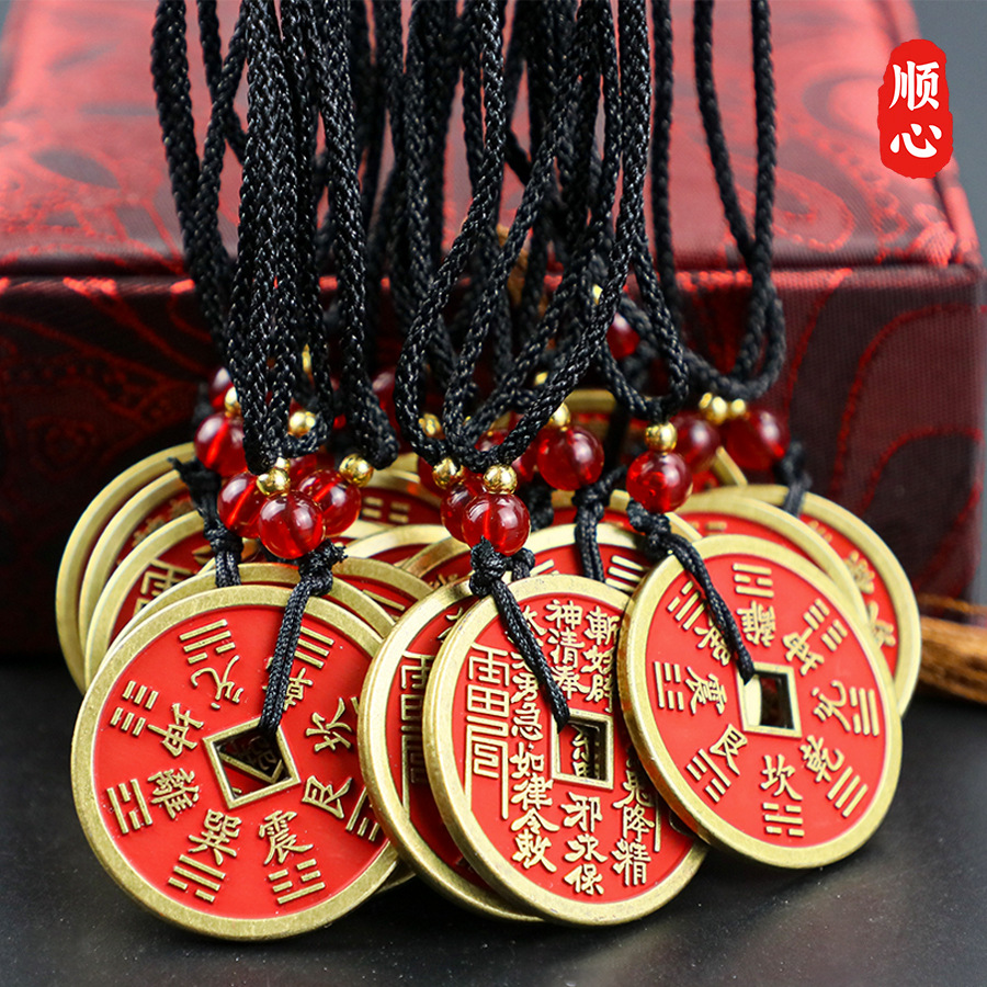 順心朱砂紅銅銭山鬼はお金を使ってレトロな硬貨の金色のネックレスのキーホルダーを厚くします。