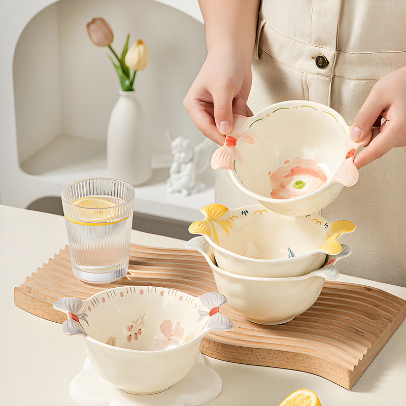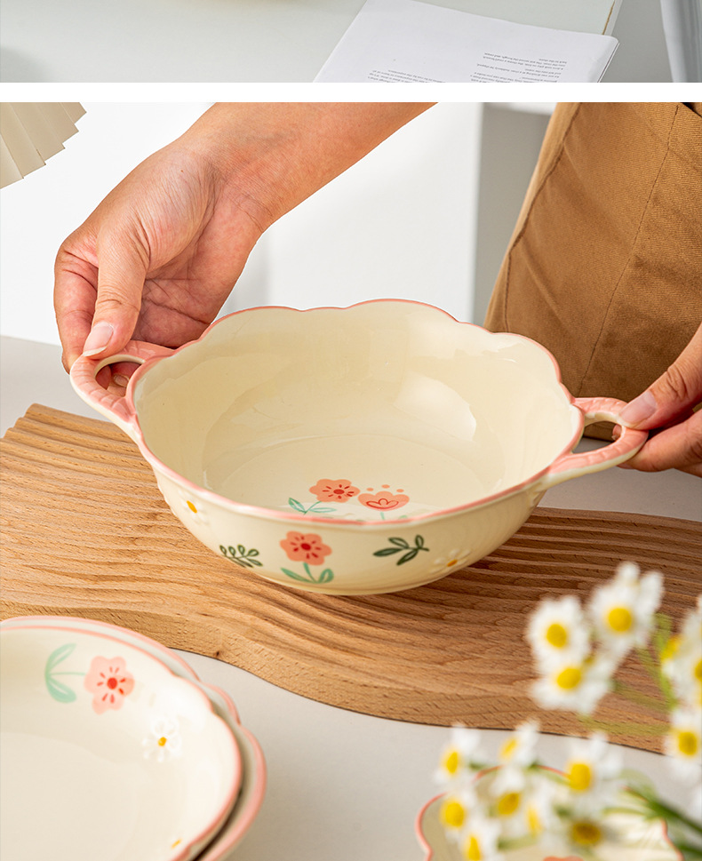 クリーム色のかわいい釉下彩陶器食器セット 家庭用ボウル皿スープボウル 高級感のあるスプーン付きボウル皿