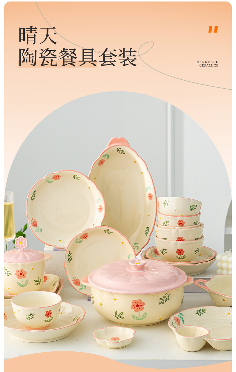高颜值粉色小清新餐具一人食米饭碗沙拉碗家用碗碟盘陶瓷晴天套装
