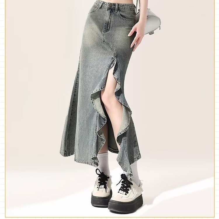 2025新款秋季复古开叉a牛仔半身裙女a字高腰显瘦不规则毛边中长裙