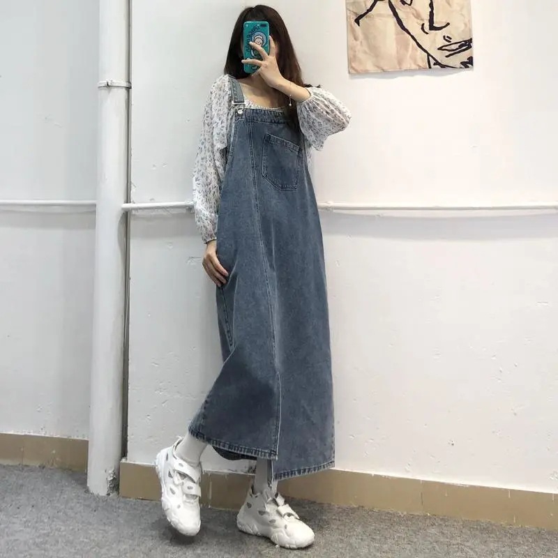 韓国風シンプルデニムスカートレディース春夏新作ハイウエストAラインミドル丈サイドスリットヒップカバーデニムスカート
