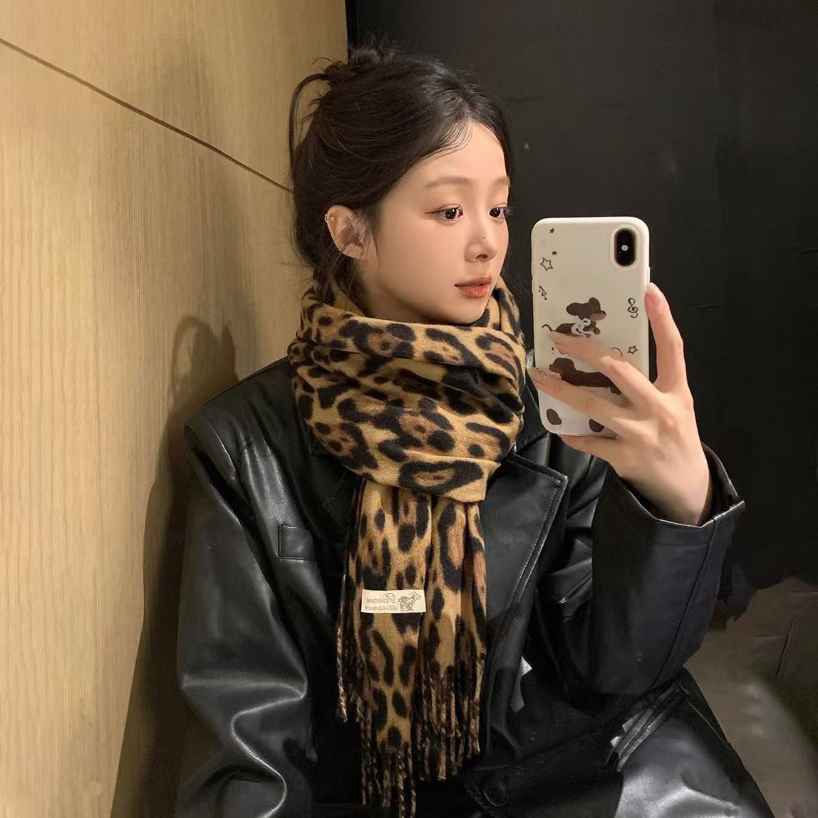 甘いクールなレトロなヒョウ柄のフリンジのマフラーの女性の2024の新型の千年のギャルの風の秋冬の厚いショールは首を囲んで保温します。