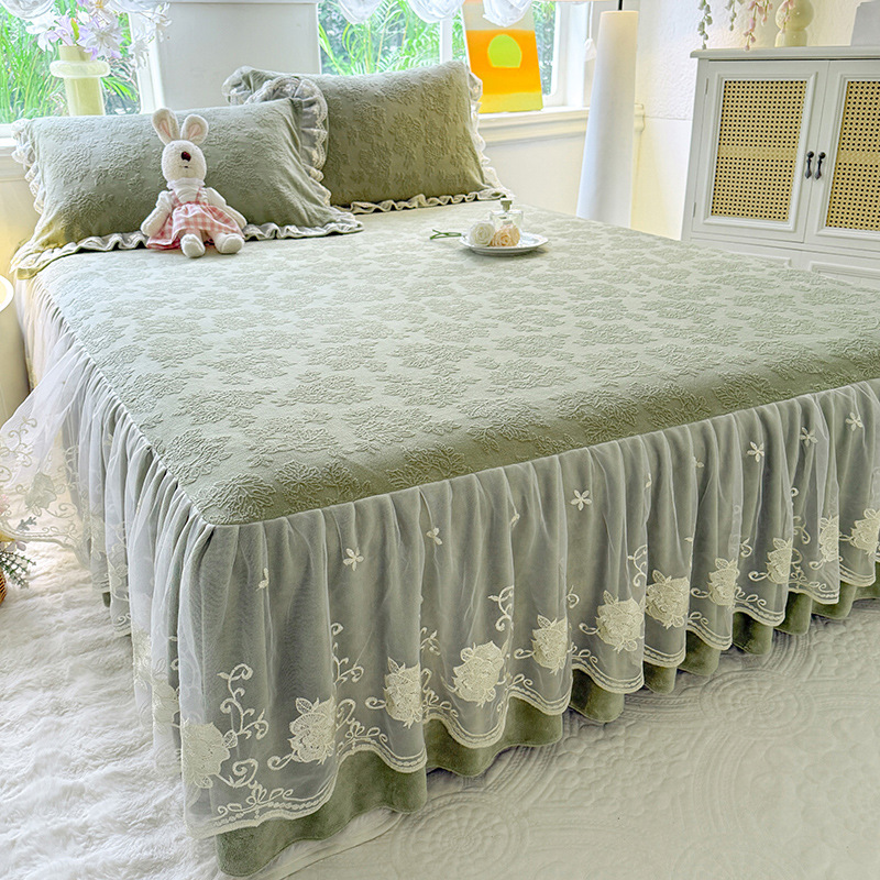 韩版雕花牛奶绒单件床裙秋冬加绒加厚床围裙保暖珊瑚绒床罩三件套