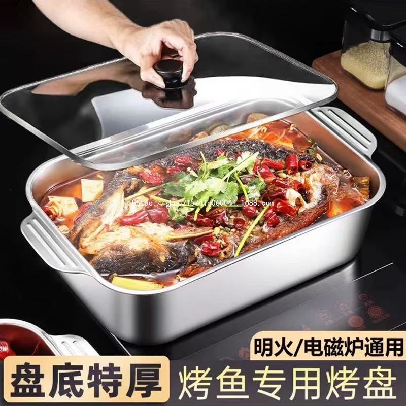 加厚不锈钢带盖烤鱼盘长方形家用食品级烤鱼专用烤盘加深托盘餐盘
