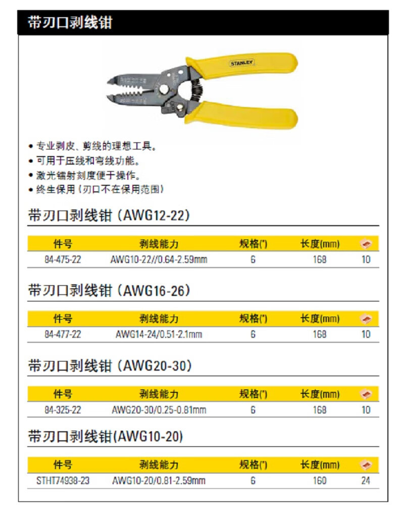 スタンレー84-325-22刃付きワイヤーストリッパー6インチ (AWG20-30)